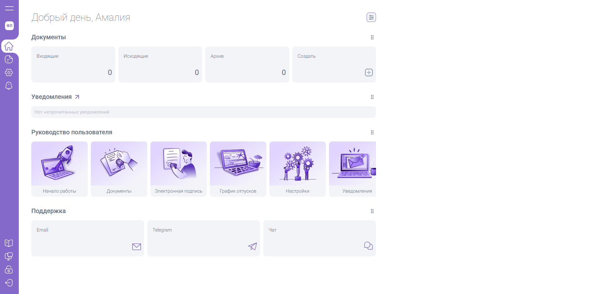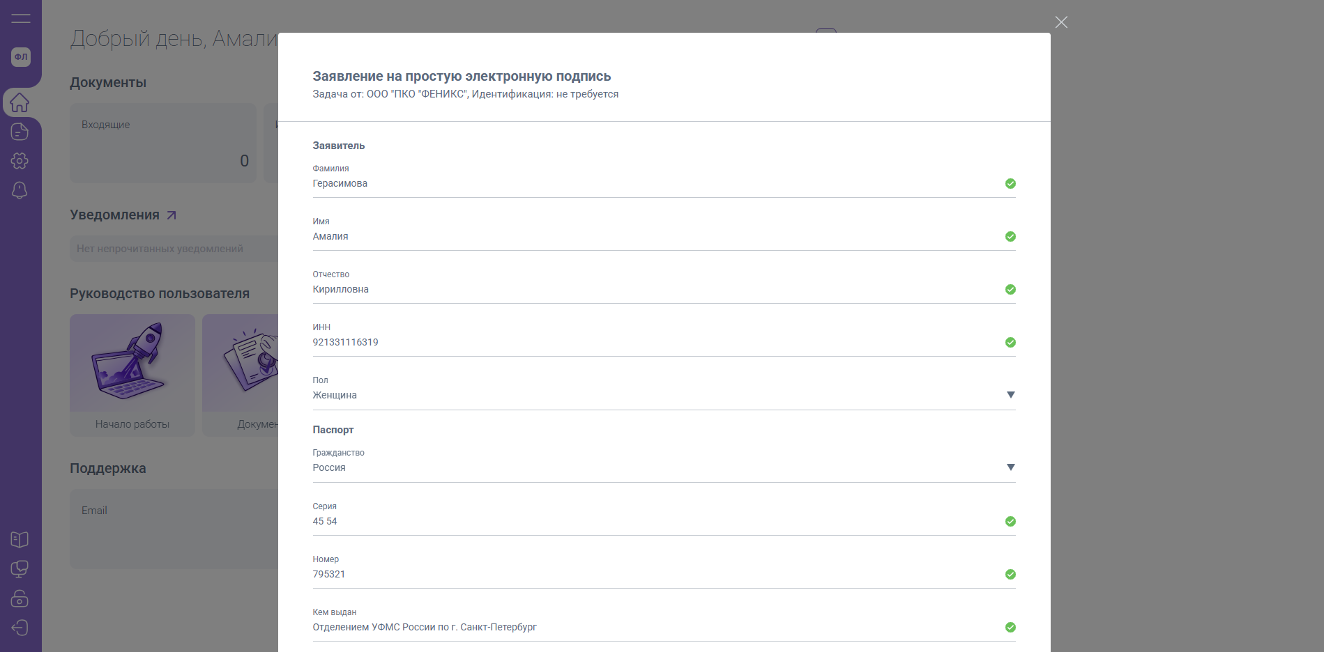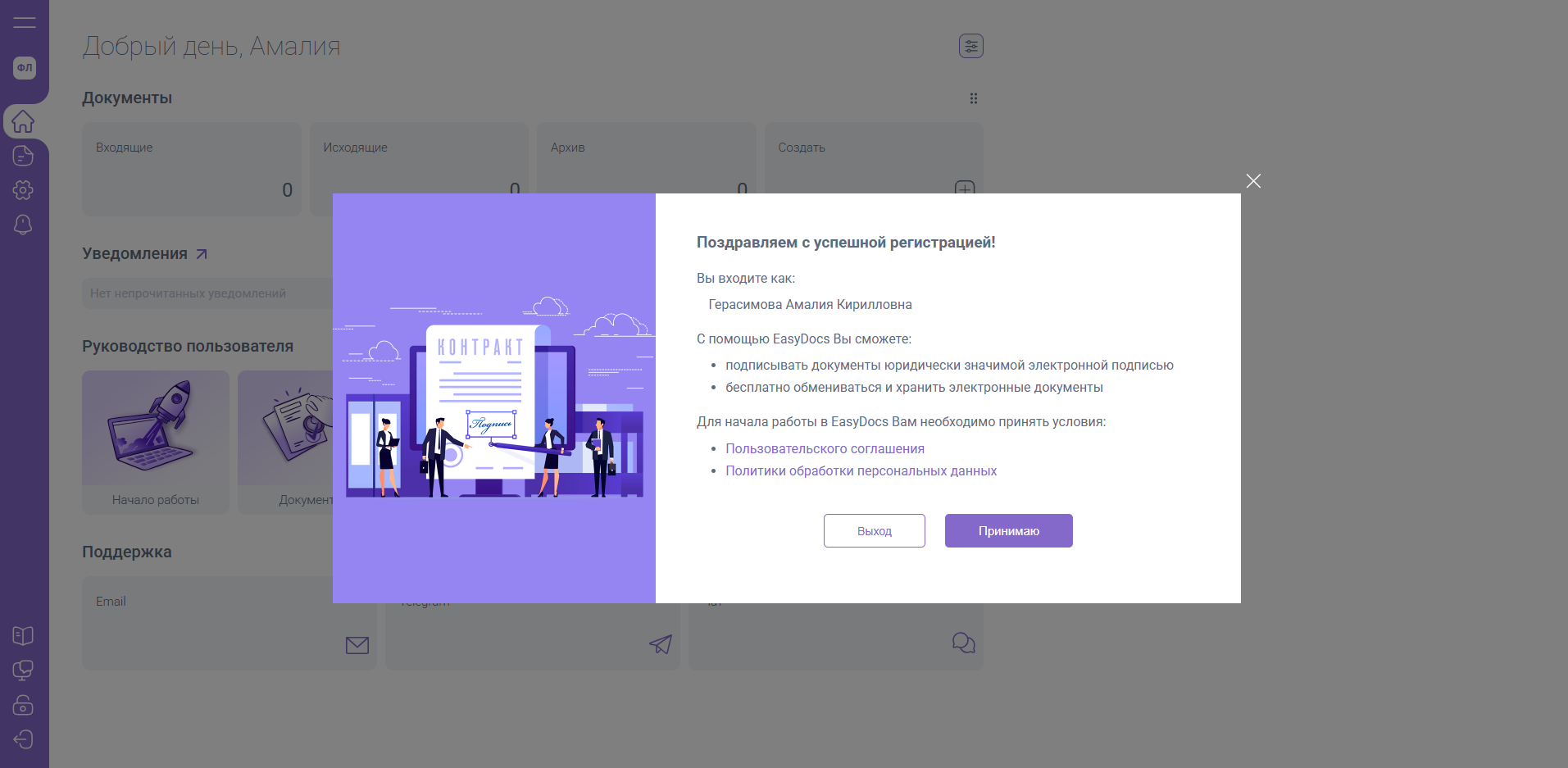 При подтверждении условий Пользовательского соглашения, Политики обработки персональных данных и завершении заполнения дополнительных форм, будет открыт доступ в личный кабинет EasyDocs.