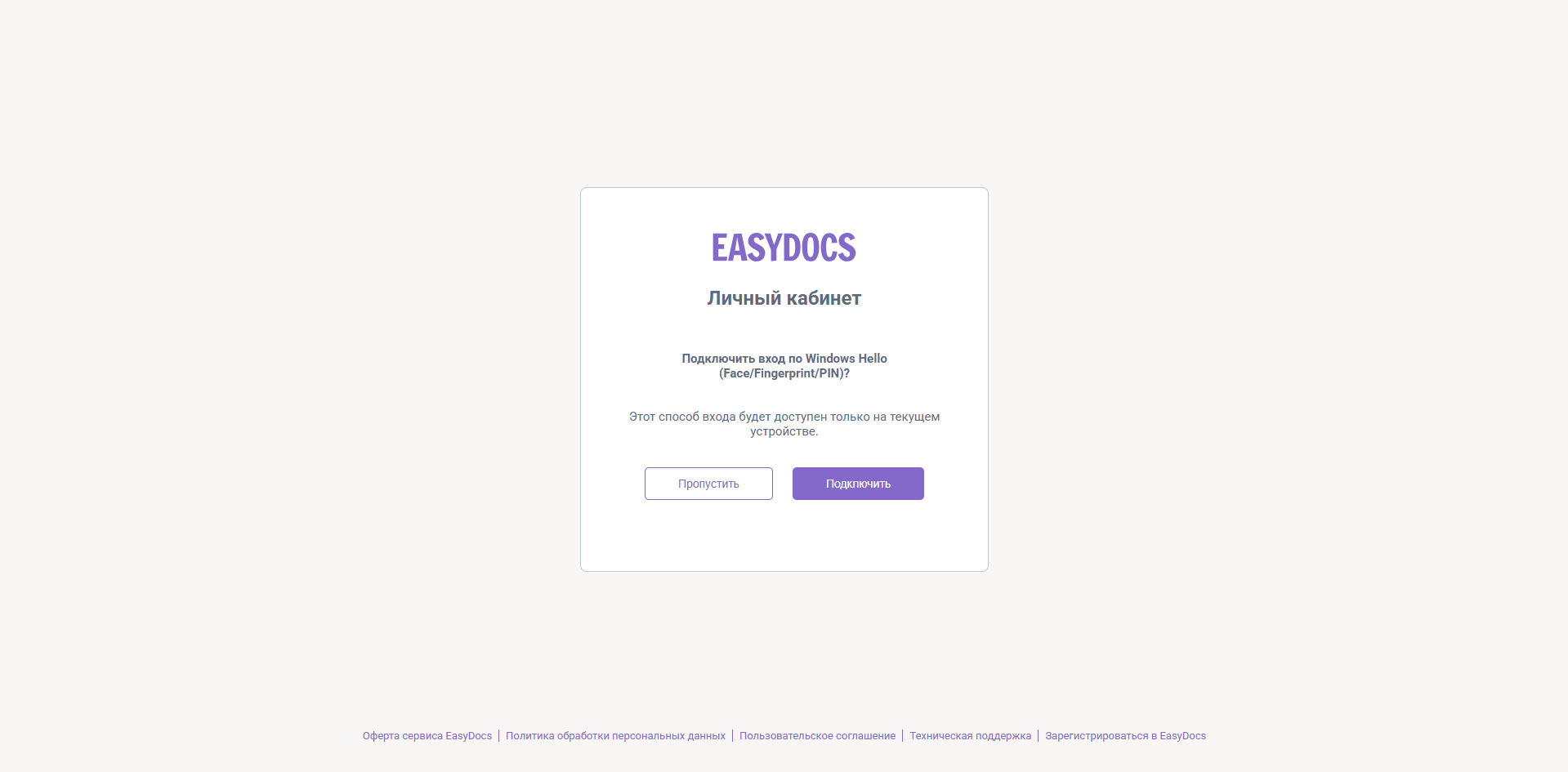 После первого успешного ввода пин-кода, вам будет предложена дополнительная возможность настройки доступа к личному кабинету по биометрии или пин-коду.