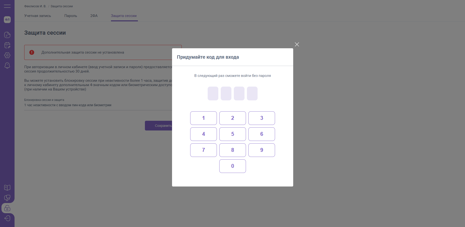 После нажатия "Сохранить" установите пин-код, который будет запрашиваться при завершении сессии.
