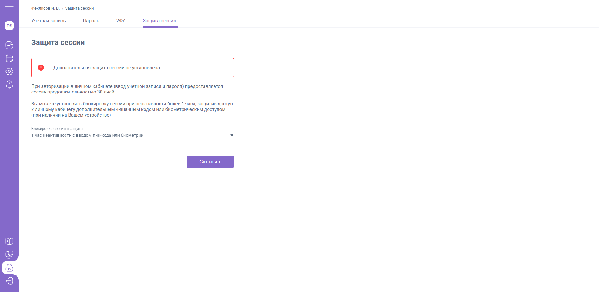 В разделе "Учетная запись и пароль" вы можете установить блокировку сессии при неактивности более 1 часа, защитив доступ к личному кабинету дополнительным 4-значным кодом или биометрическим доступом (при наличии на вашем устройстве).