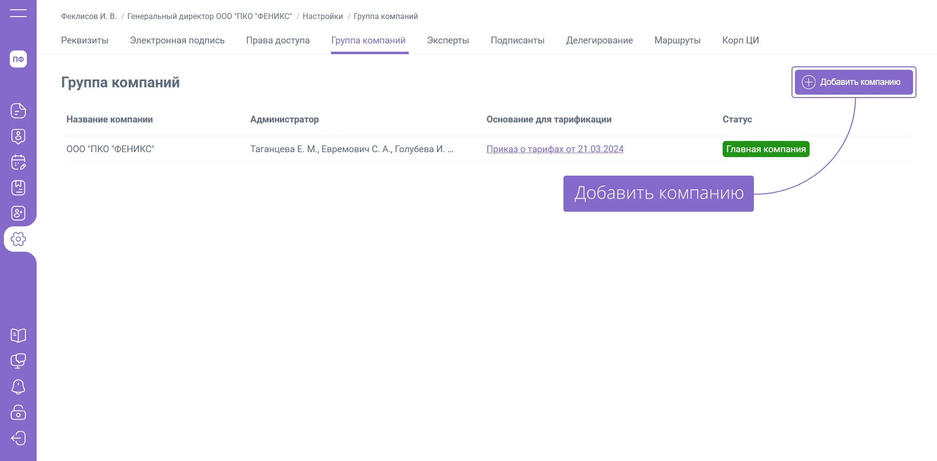 - Перейдите в раздел «Настройки» / «Группа компаний»