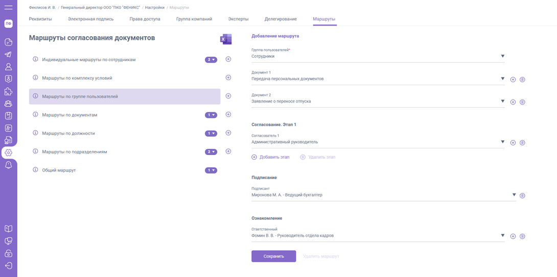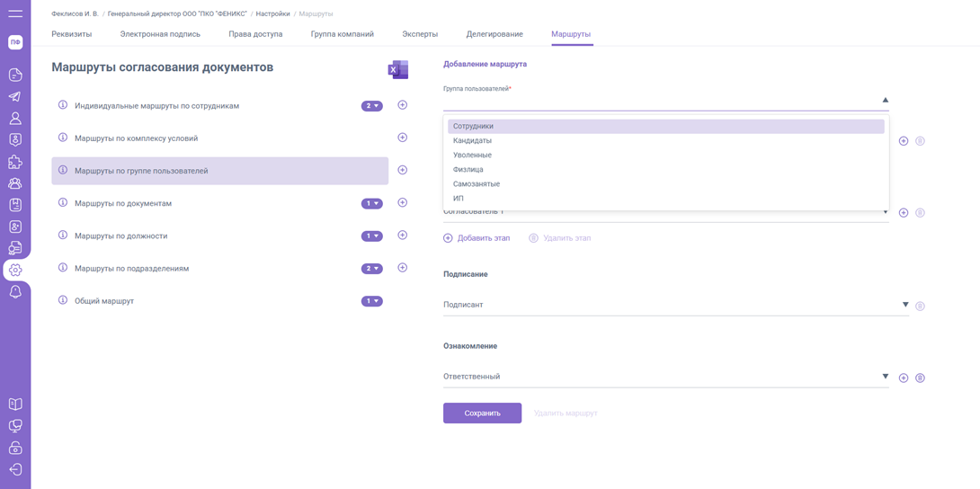 Список поля «Группы пользователей» будет содержать системные группы EasyDocs (Сотрудники, Кандидаты, Уволенные, Физлица, Самозанятые, ИП). В разделе «Пользователи» на вкладке «Группы» вы сможете добавить новые группы пользователей, которые отобразятся в списке маршрута.