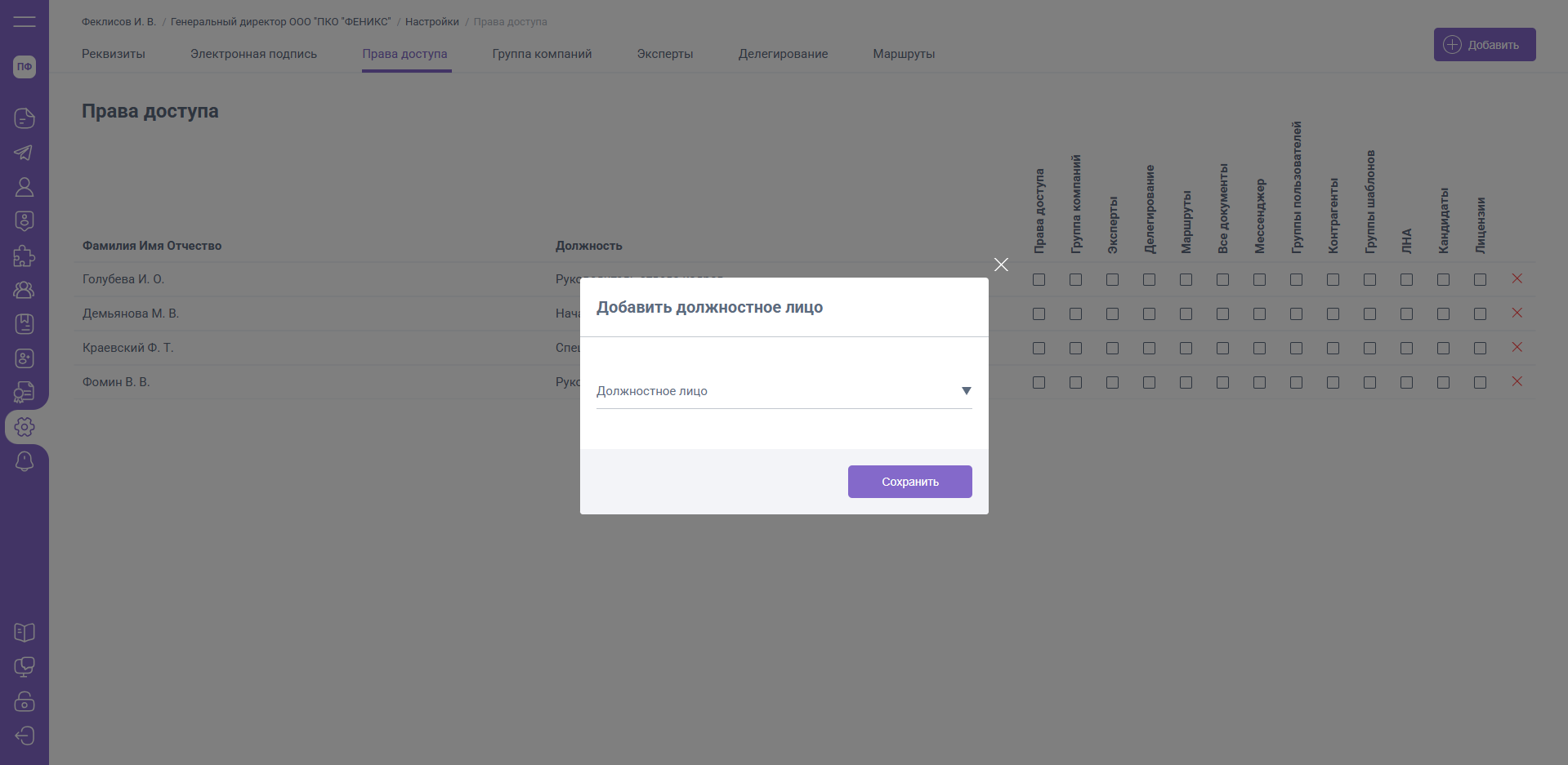 Права доступа могут быть назначены только должностным лицам, которые имеют роль внутри Вашей организации (Эксперты, Подписанты, Руководители). Для обновления списка тех, кому Вы назначаете права, нажмите кнопку «Добавить», выберите должностное лицо из выпадающего списка.