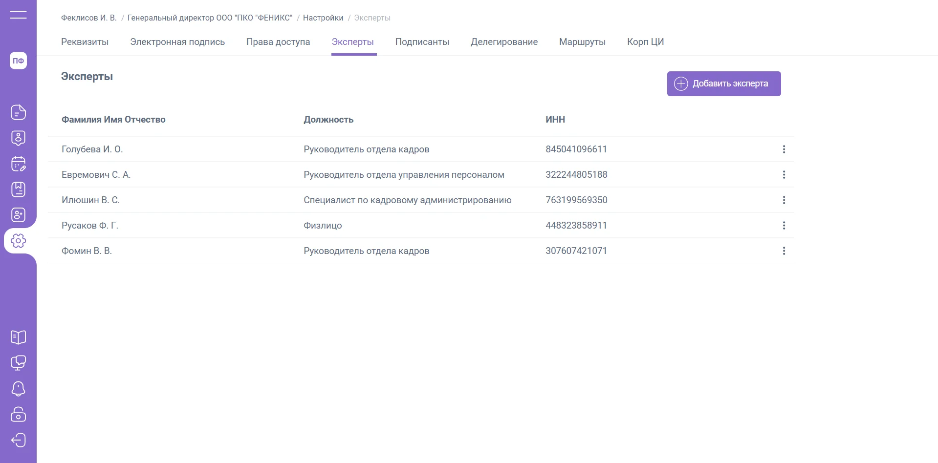 Работа с экспертами осуществляется в разделе «Настройки» / «Эксперты».
