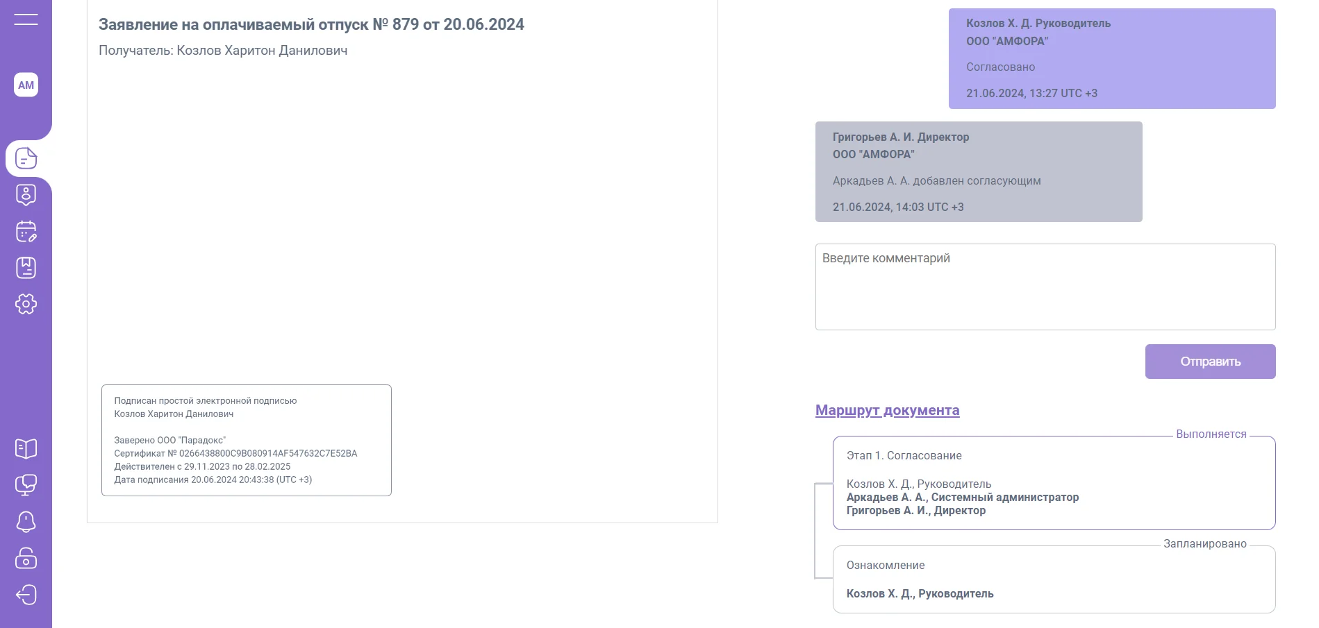 Если внутри компании выгружена орг. структура и настроены маршруты, должностным лицам и сотрудникам, будет доступен просмотр маршрута согласования направленного документа.