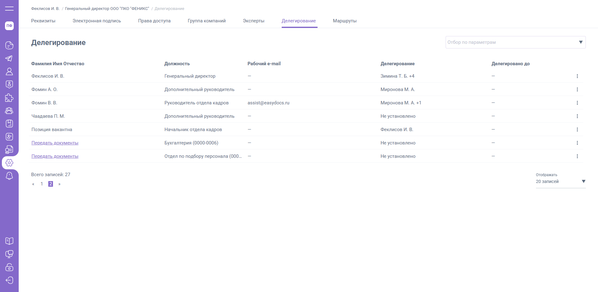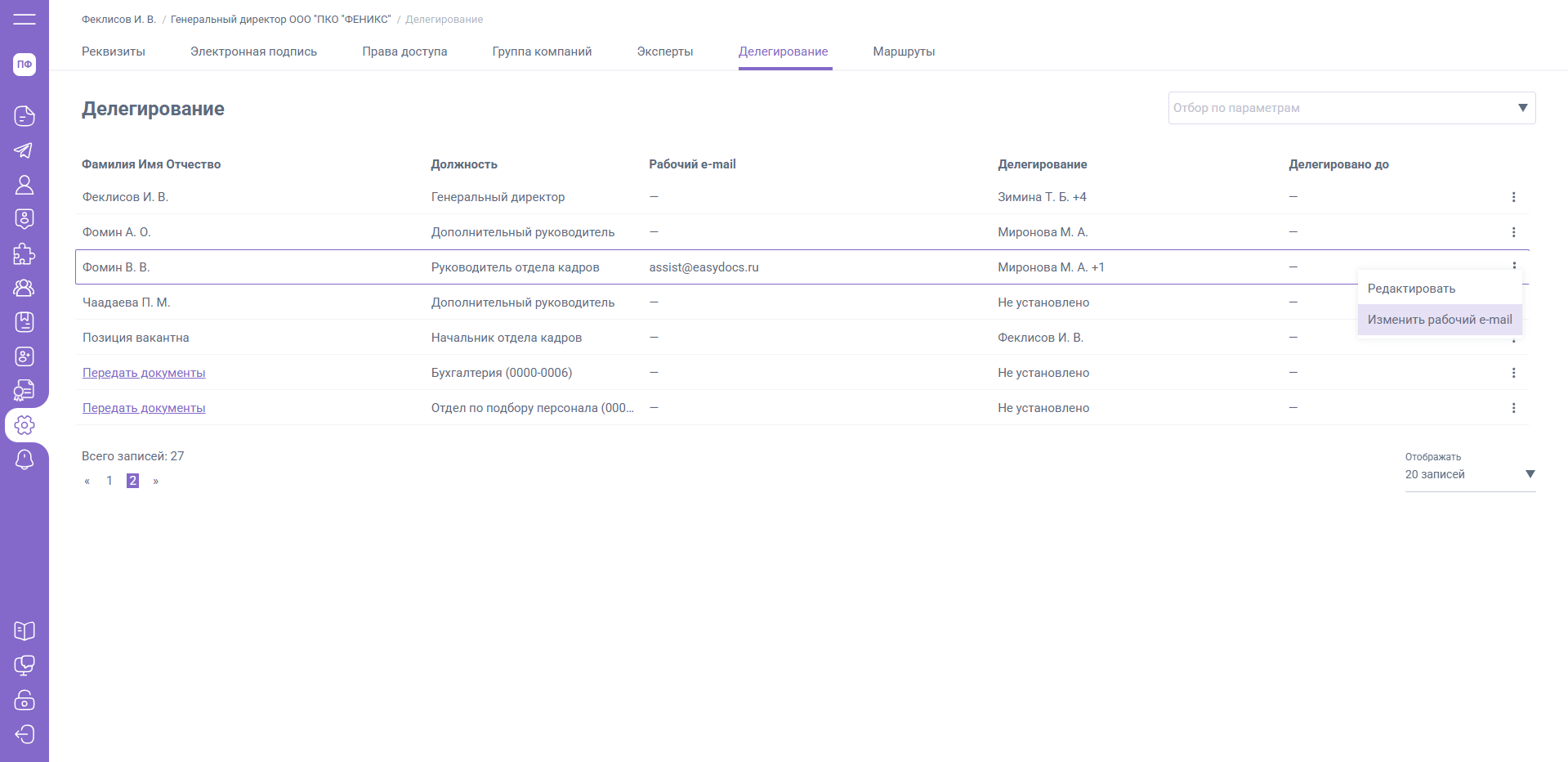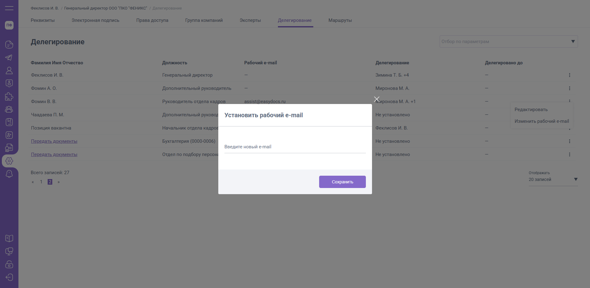 Редактирование рабочего e-mail доступно в разделе «Настройки» / «Делегирование» генеральным директорам (индивидуальным предпринимателям) владельцам роли и администраторам системы.