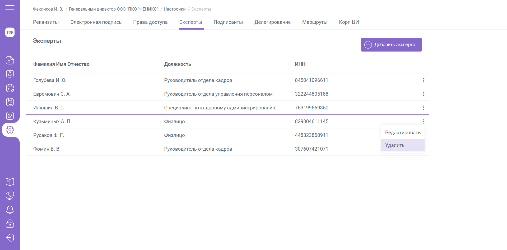 Редактирование и удаление экспертов