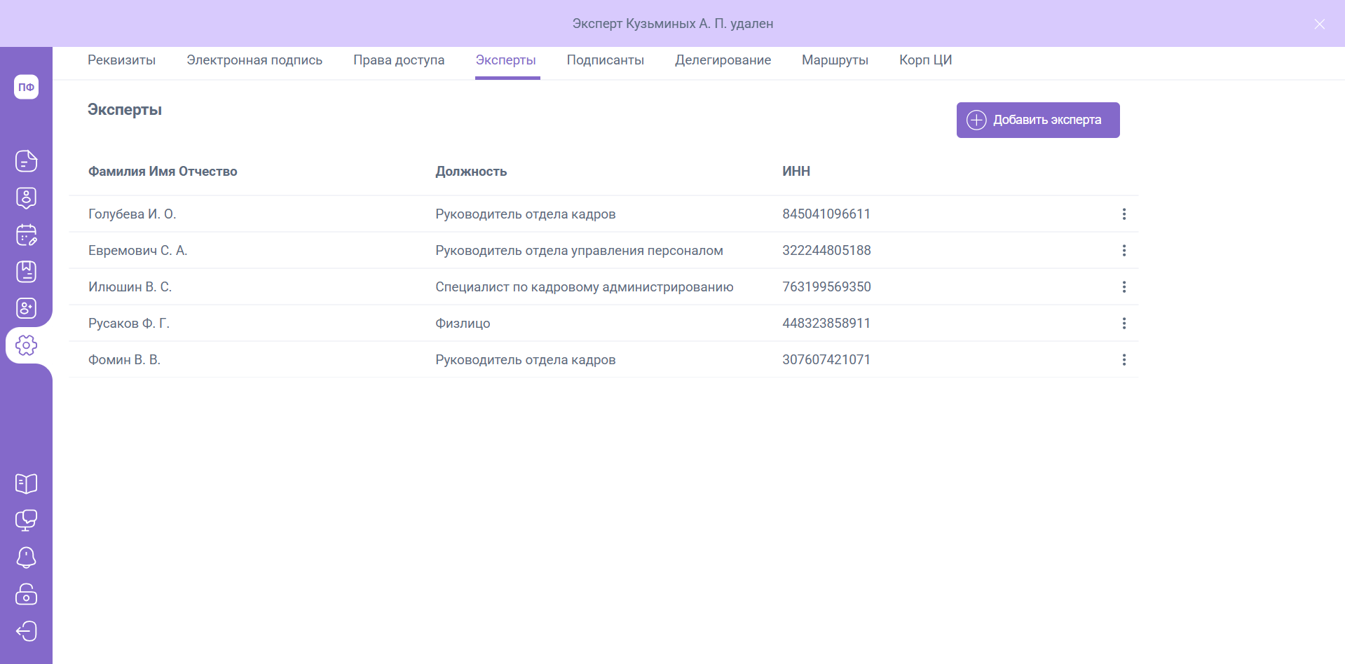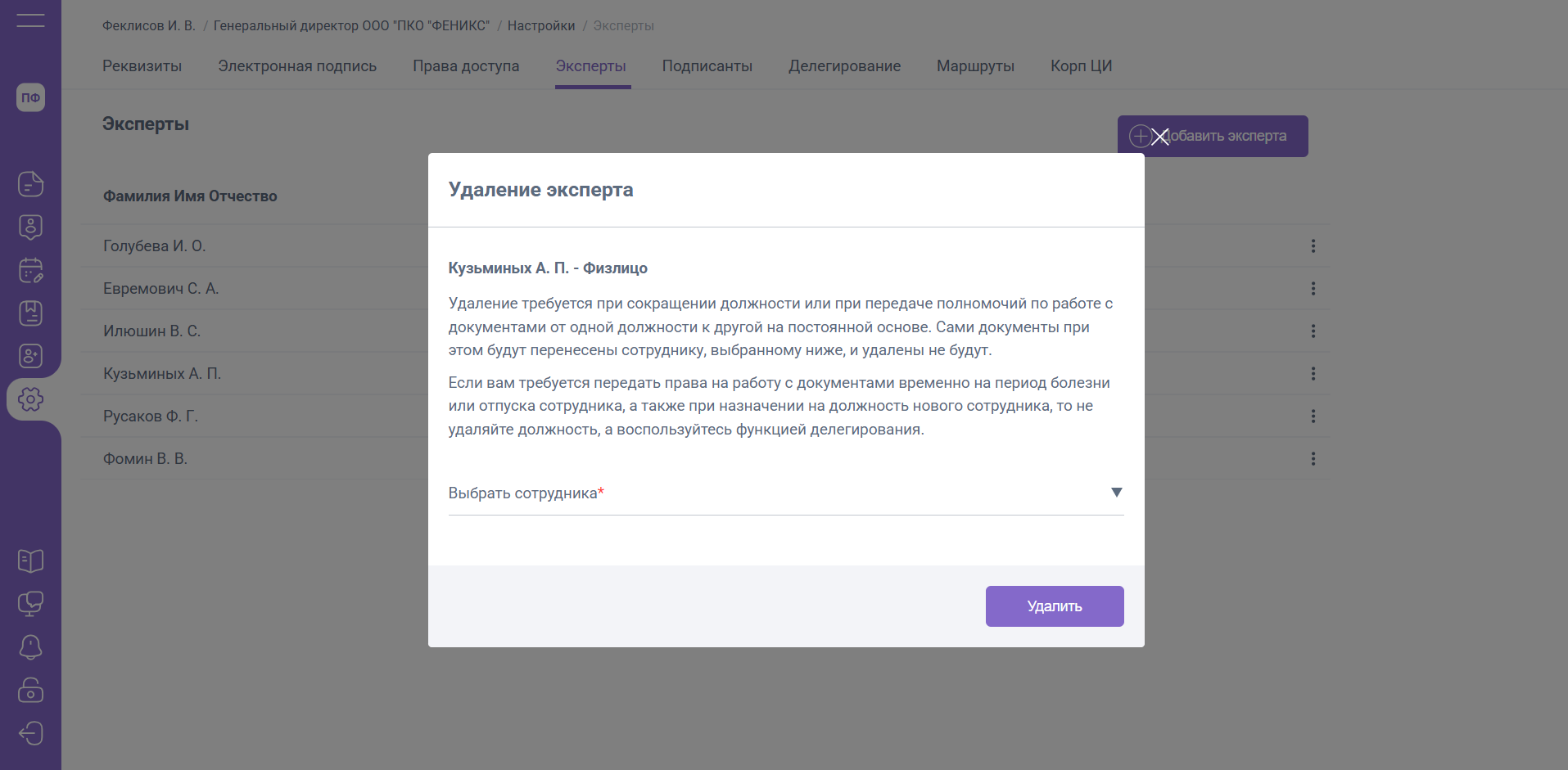 При нажатии кнопки «Удалить» роль Эксперта будет удалена.