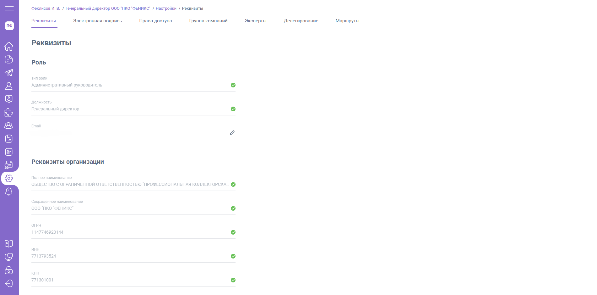 В роли юридического лица / индивидуального предпринимателя раздел «Настройки» / «Реквизиты» содержит следующие данные: