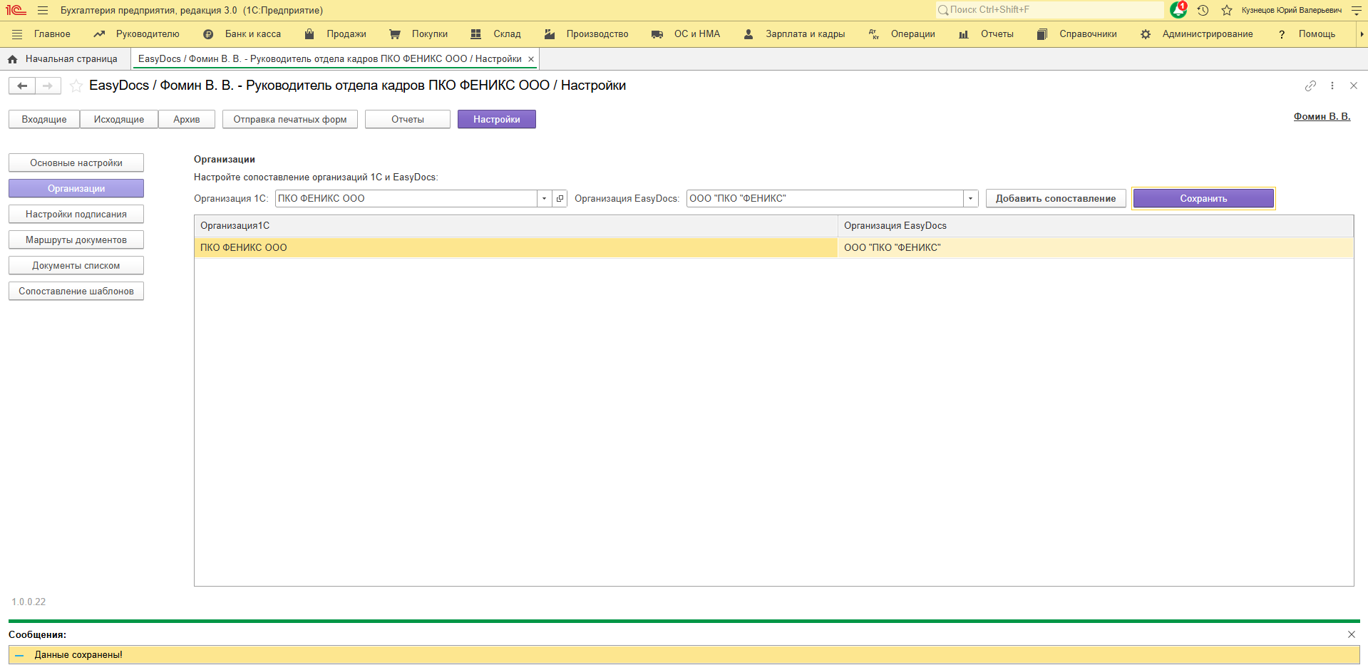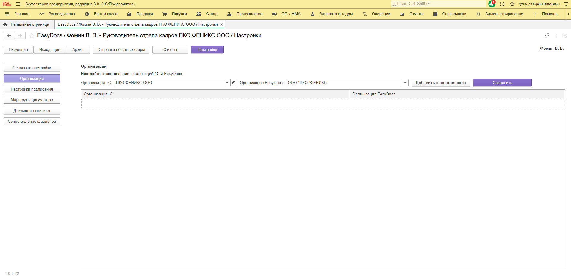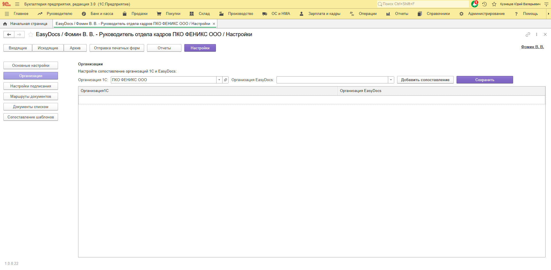 В списке «Организация EasyDocs» (для выбора будут доступны только те юридические лица, в которых у авторизованного пользователя есть роль должностного лица) выберите соответствующее «Организации 1С» юридическое лицо.