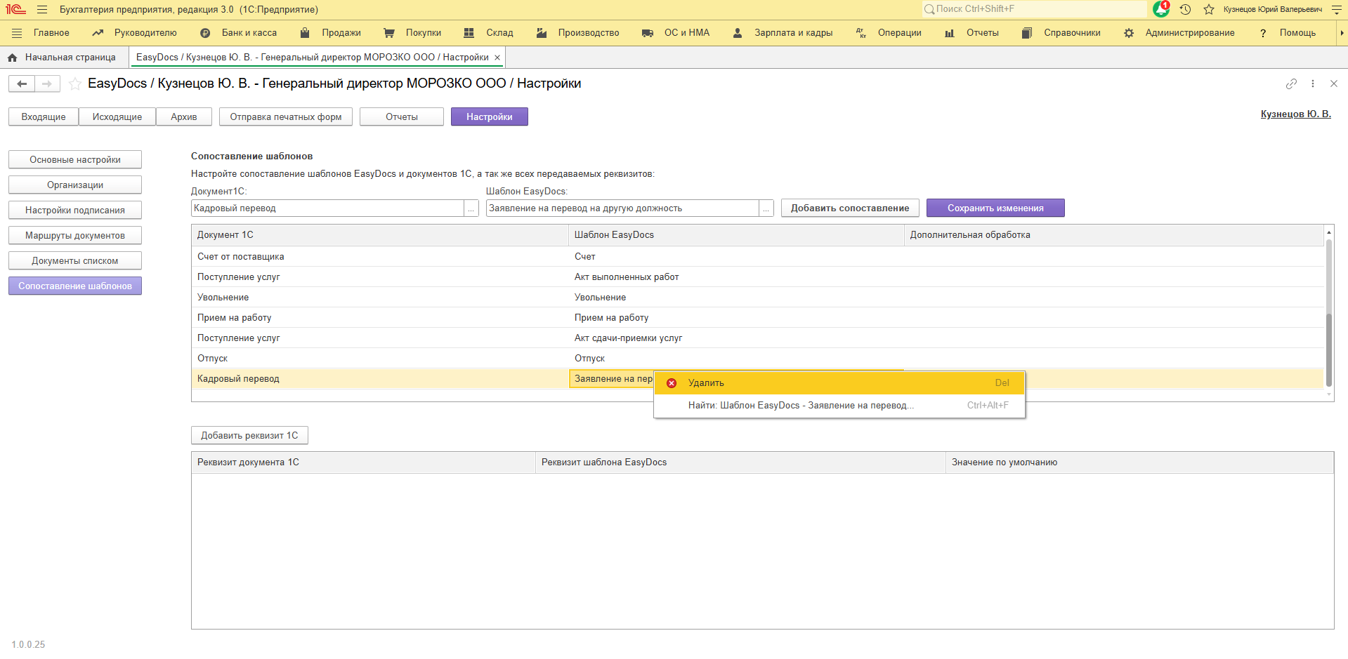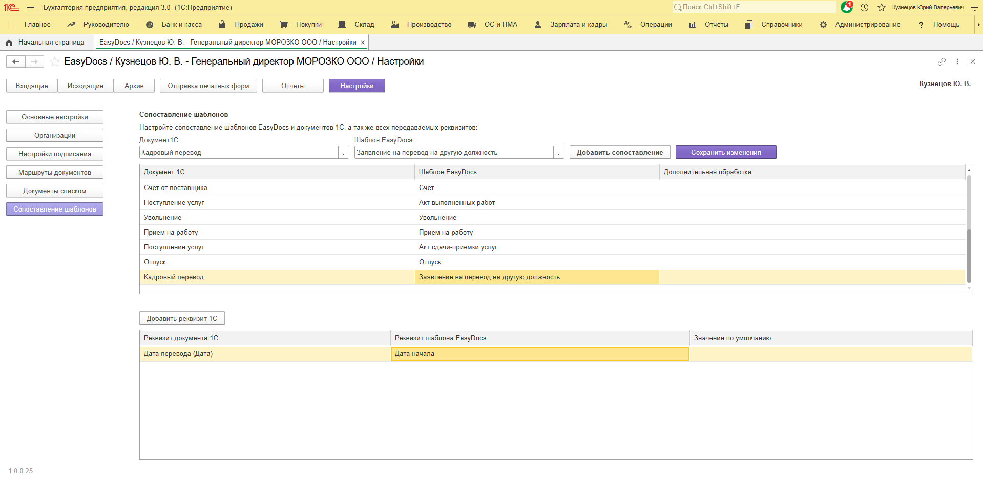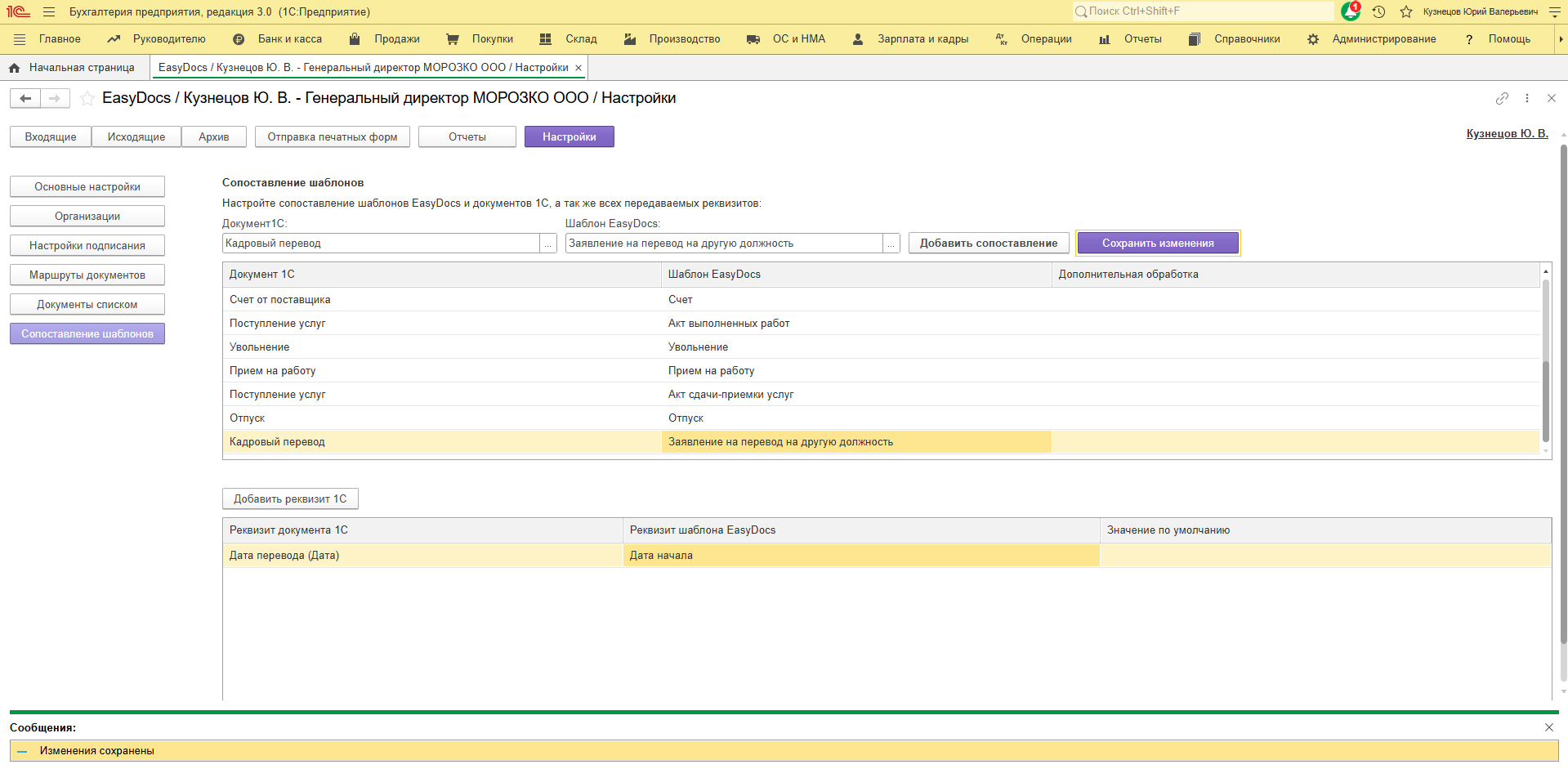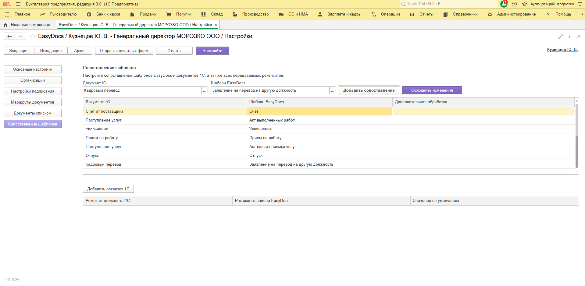 Также на этой форме есть два вида системных шаблонов EasyDocs, которые используются для автоматической подстановки данных о создателе документа: