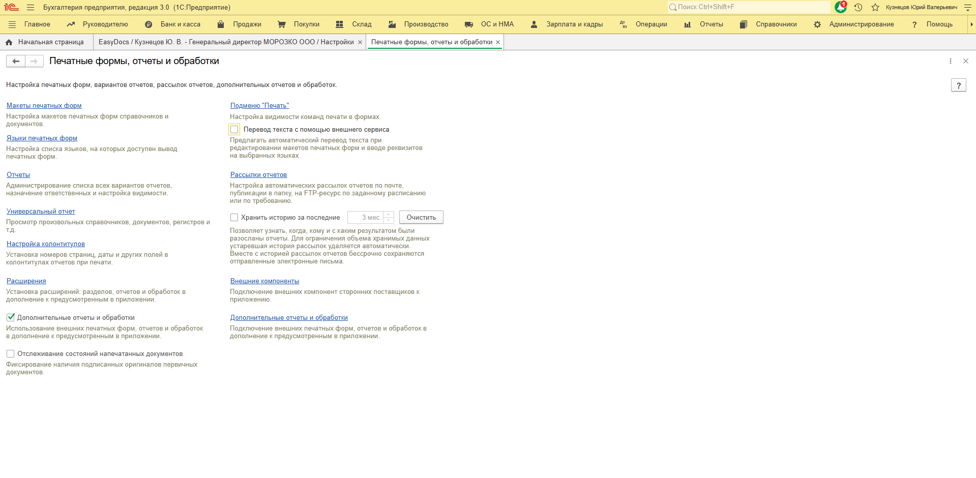 - Перейдите в раздел «Администрирование» / «Печатные формы, отчеты и обработки» / «Дополнительные отчеты и обработки»
