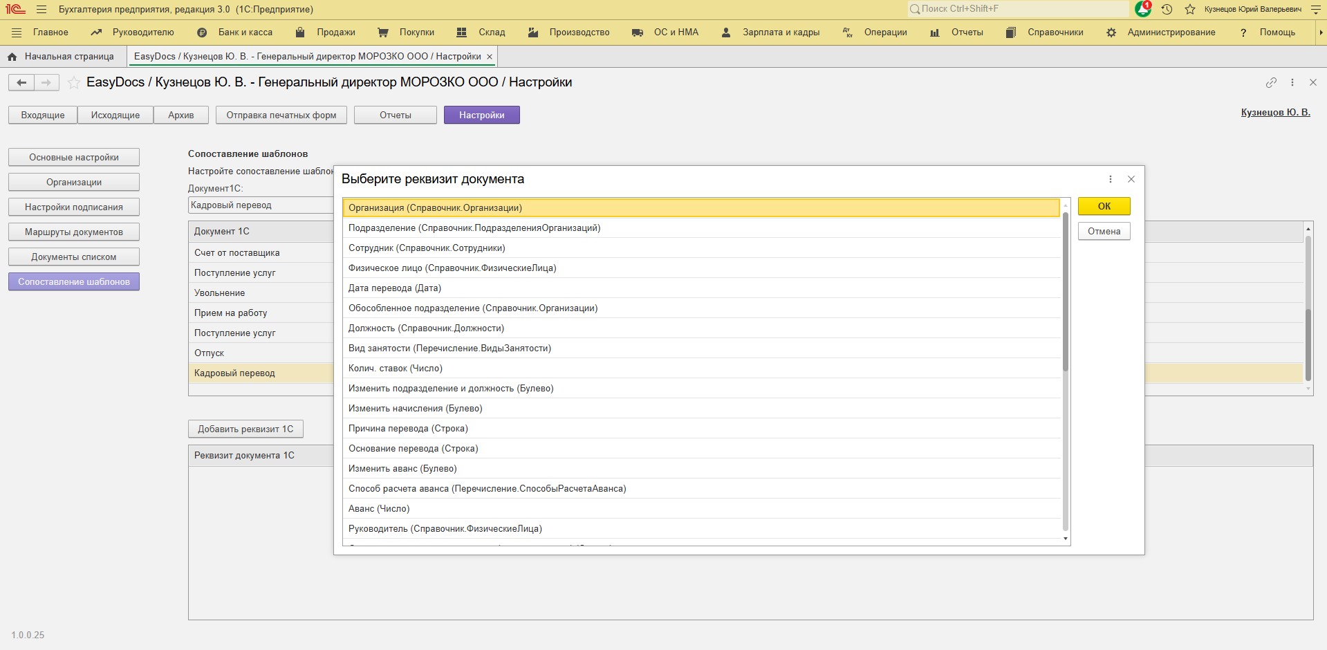 Для того чтобы поля документа 1С заполнялись данными шаблона EasyDocs, необходимо сопоставить реквизиты. Кнопка «Добавить реквизит 1С» доступна как для системных шаблонов EasyDocs, так и для шаблонов, созданных внутри Вашей компании. На форме подбора будут отображены все реквизиты, относящиеся к документу 1С.