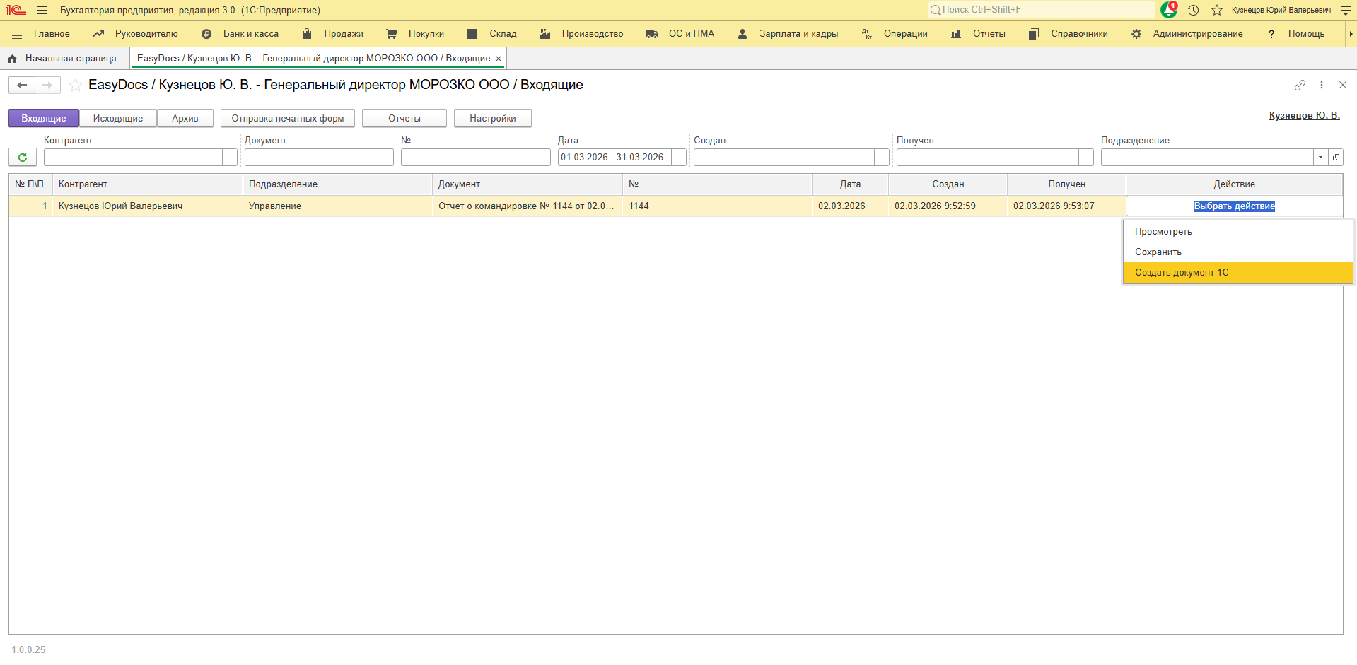 Документ EasyDocs, а также его вложения будут прикреплены «Под скрепку» создаваемого документа 1С.