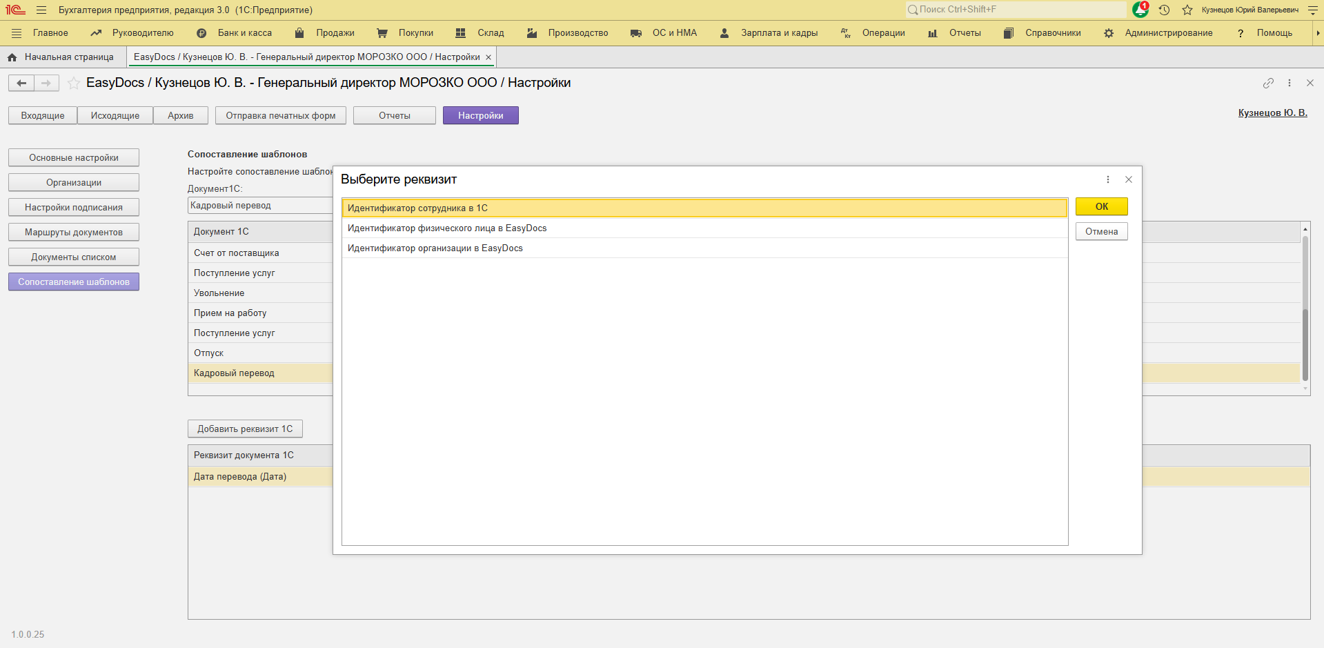 - Выбрать «Шаблон EasyDocs», подходящий документу 1C