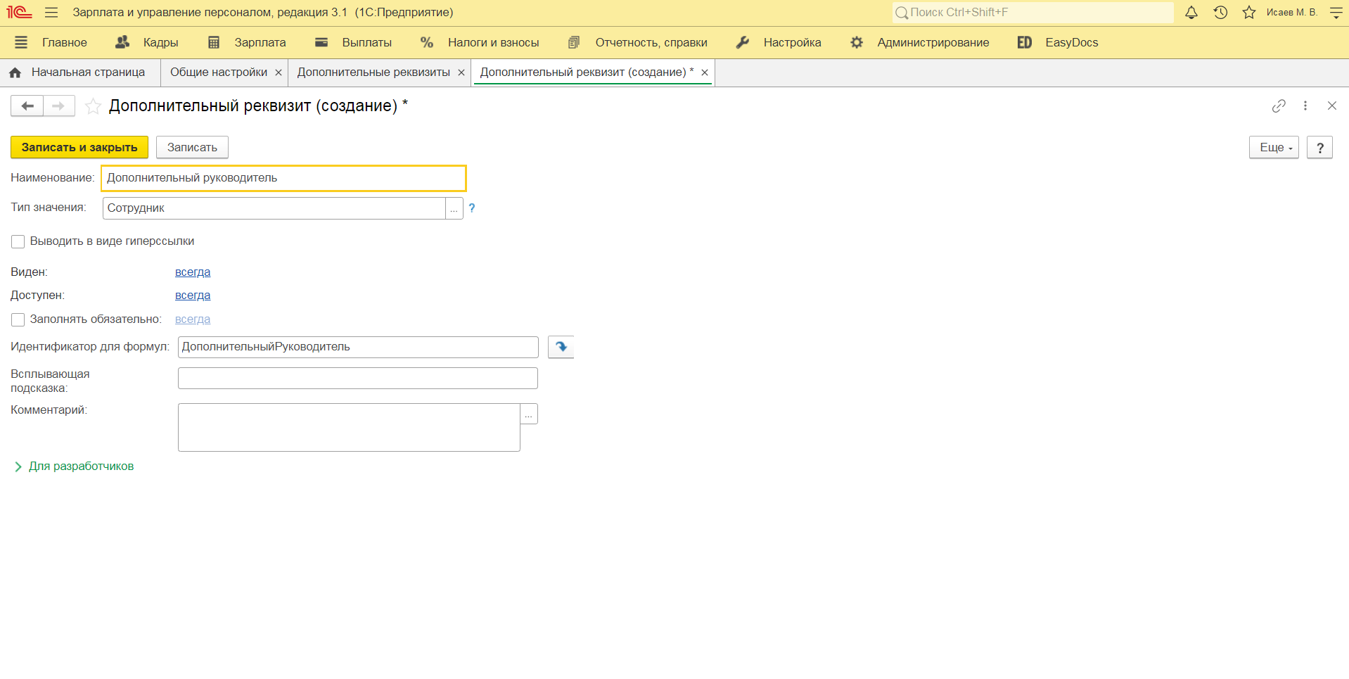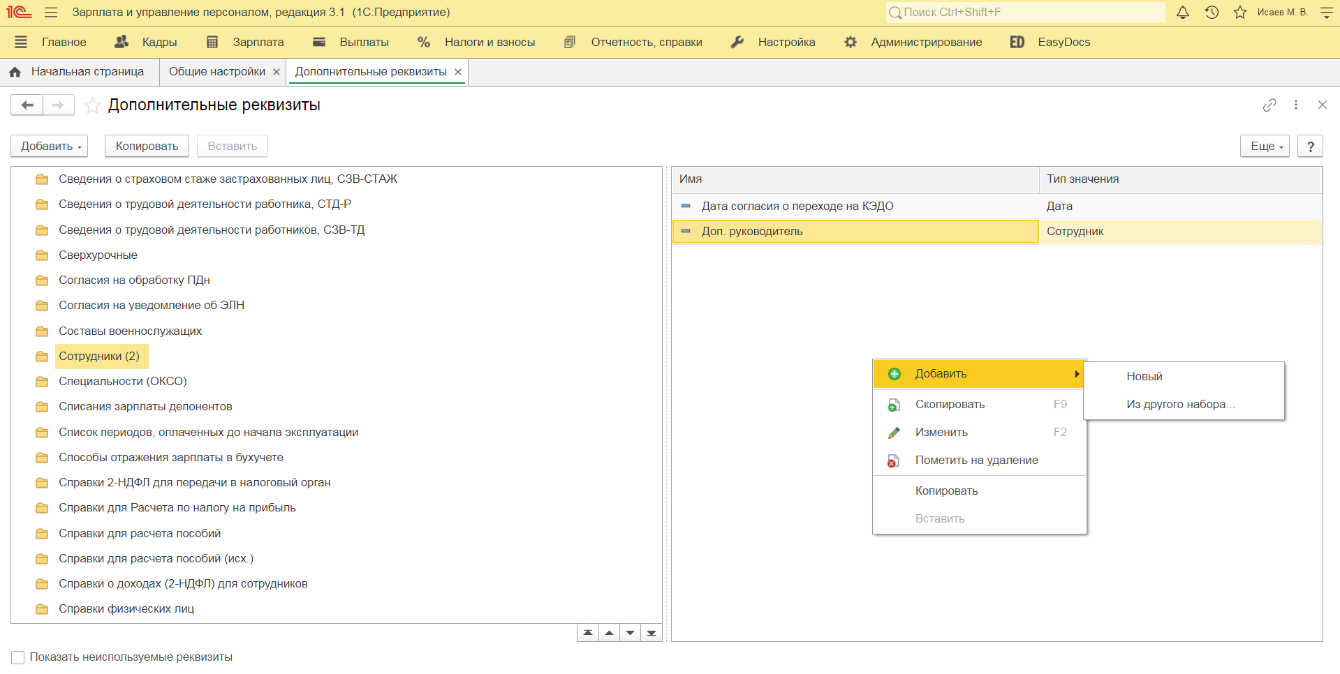 Определение дополнительного руководителя производится с помощью дополнительного реквизита сотрудника. Добавление такого реквизита производится в разделе 1С: ЗУП / Администрирование / Общие настройки.