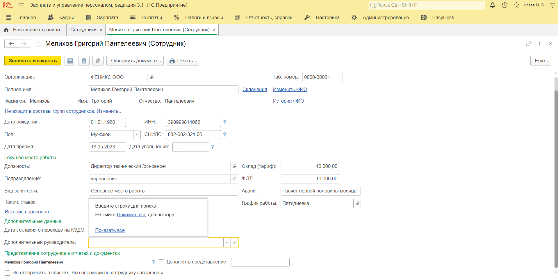 Добавление дополнительного руководителя в карточку сотрудника