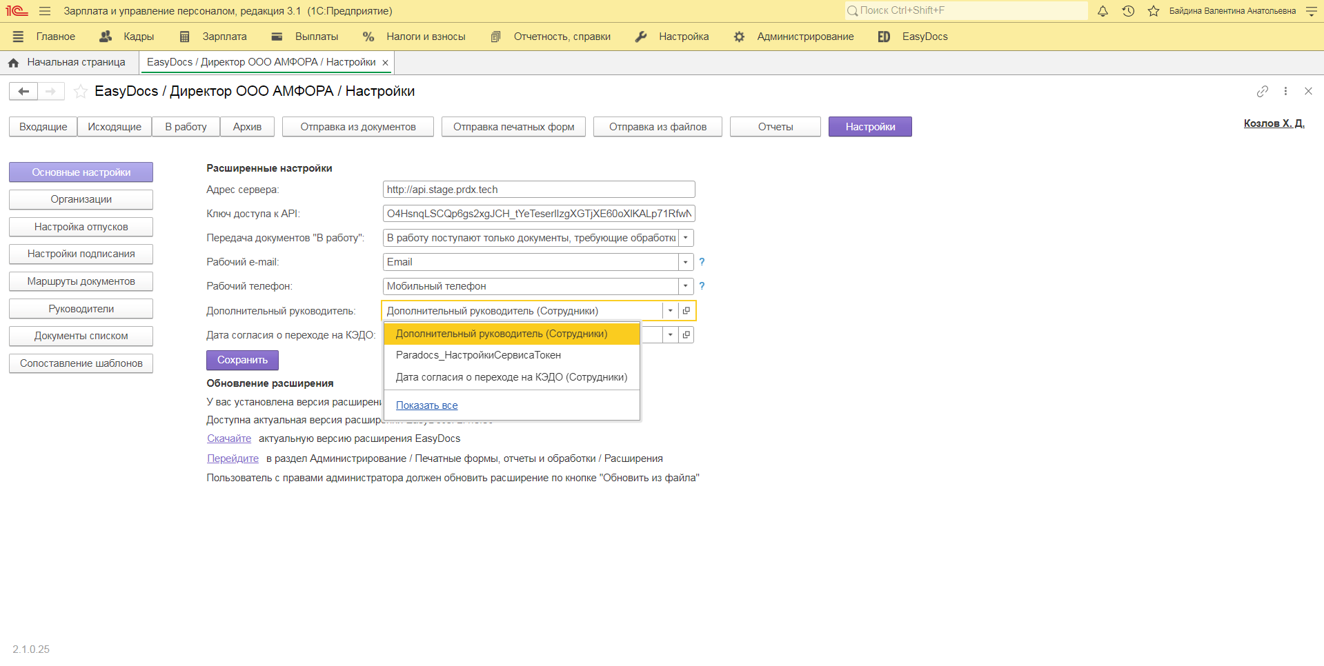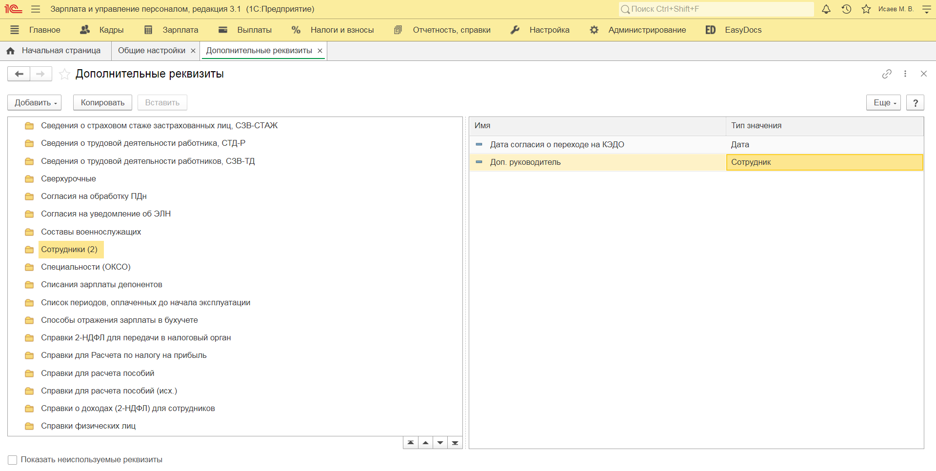После того, как были назначены дополнительные руководители Вам необходимо перейти в расширение EasyDocs раздел «Настройки» / «Основные настройки» и выбрать реквизит, который будет использоваться для определения дополнительного руководителя.