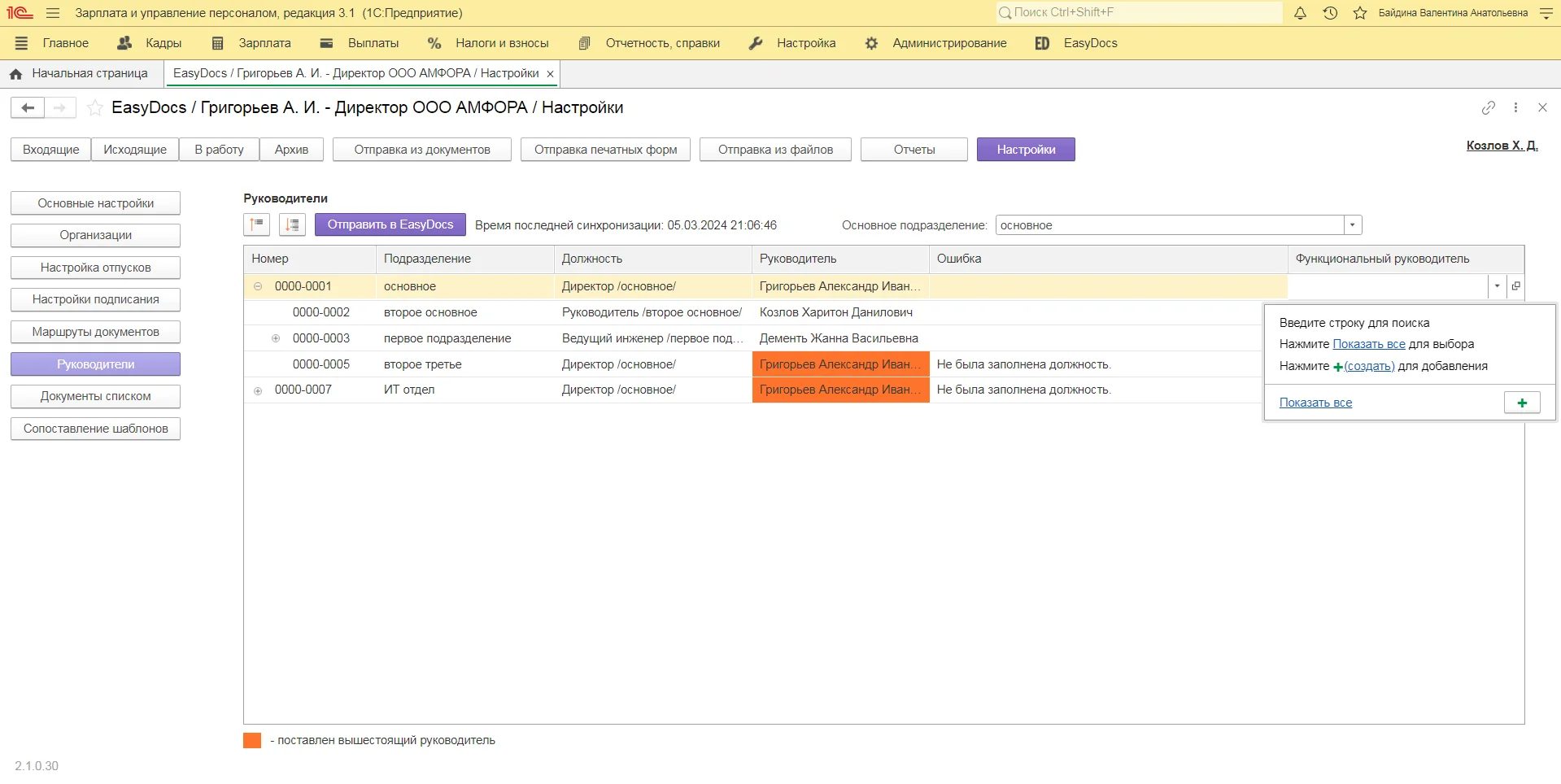 Если в вашей организации используется матричная структура и у сотрудников кроме административного руководителя также есть функциональный руководитель, то EasyDocs позволяет настроить автоматическое согласование с такими руководителями. Для этого в настройках расширения EasyDocs для 1С: ЗУП в разделе «Руководители» необходимо добавить функциональных руководителей подразделений.