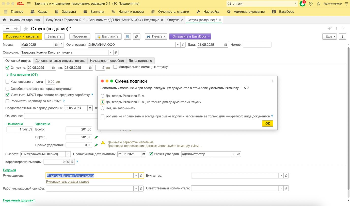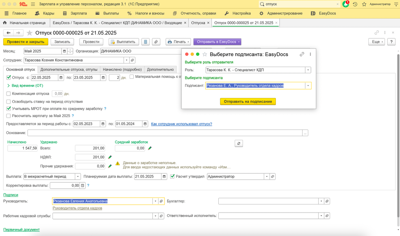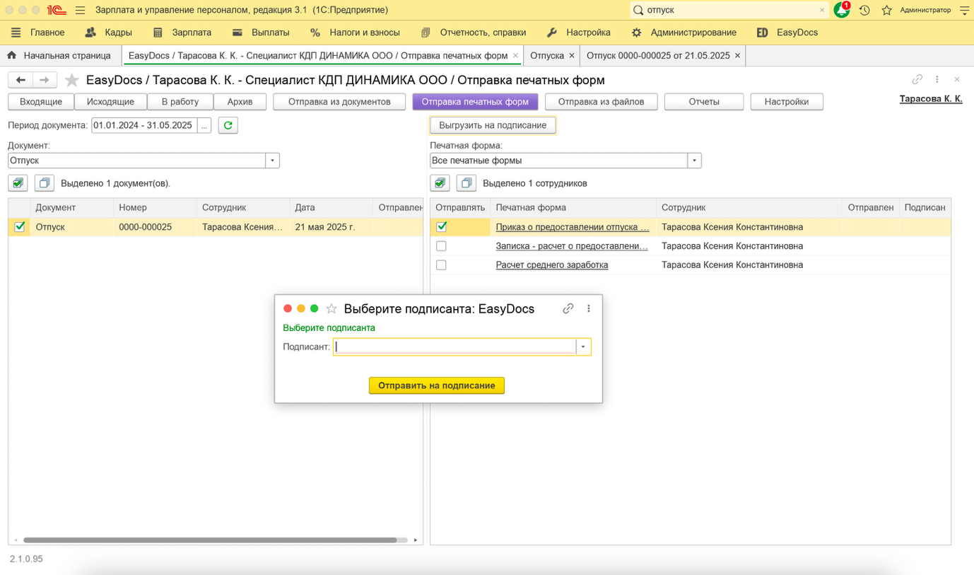 Если документ, отправляемый из расширения 1С ЗУП, требует подписания со стороны работодателя, то потребуется указать подписанта.