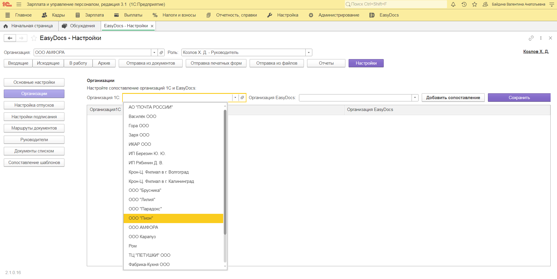 В списке «Организация EasyDocs» (для выбора будут доступны только те юридические лица, в которых у авторизованного пользователя есть роль должностного лица) выберите соответствующее «Организации 1С» юридическое лицо.