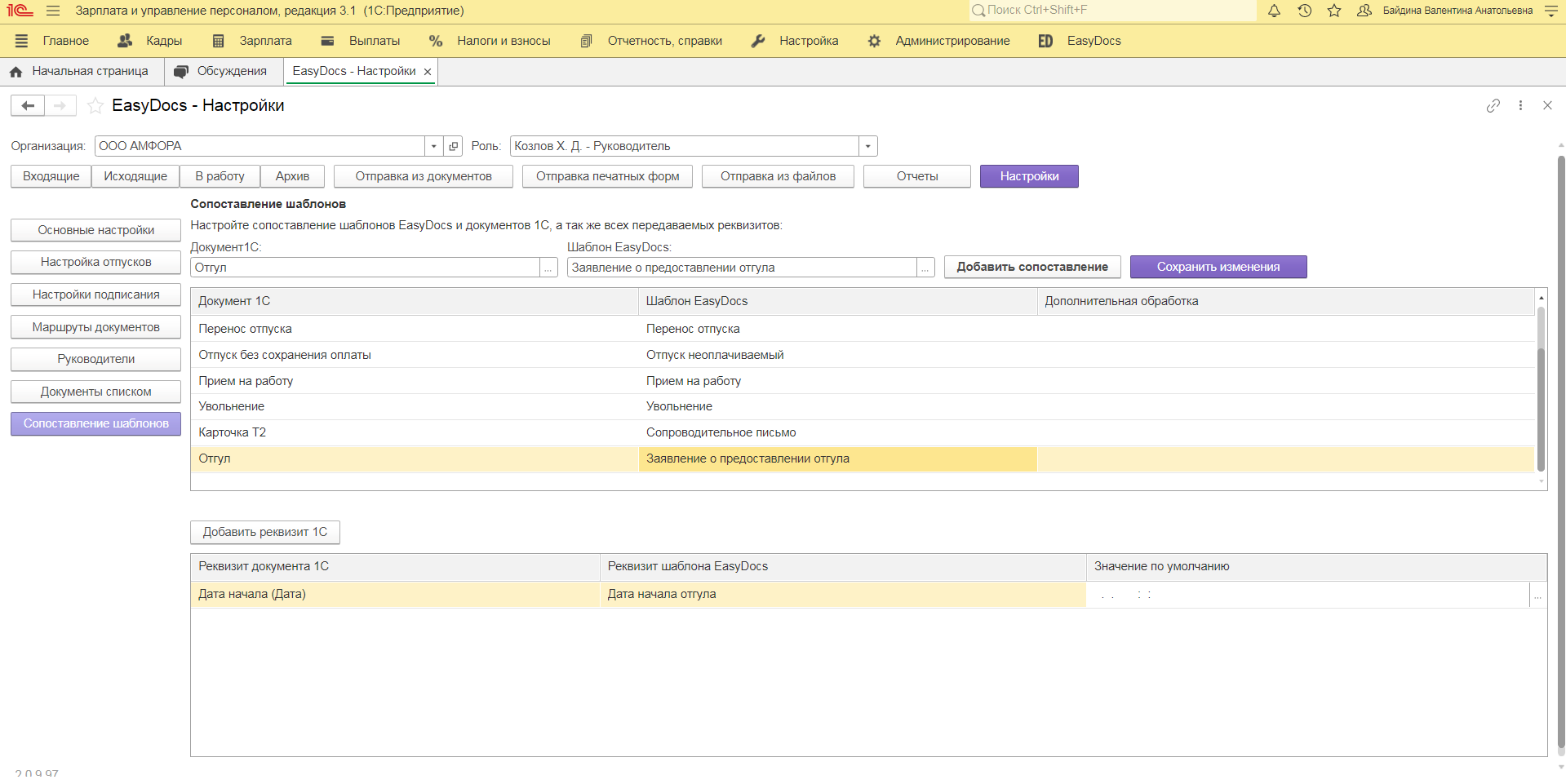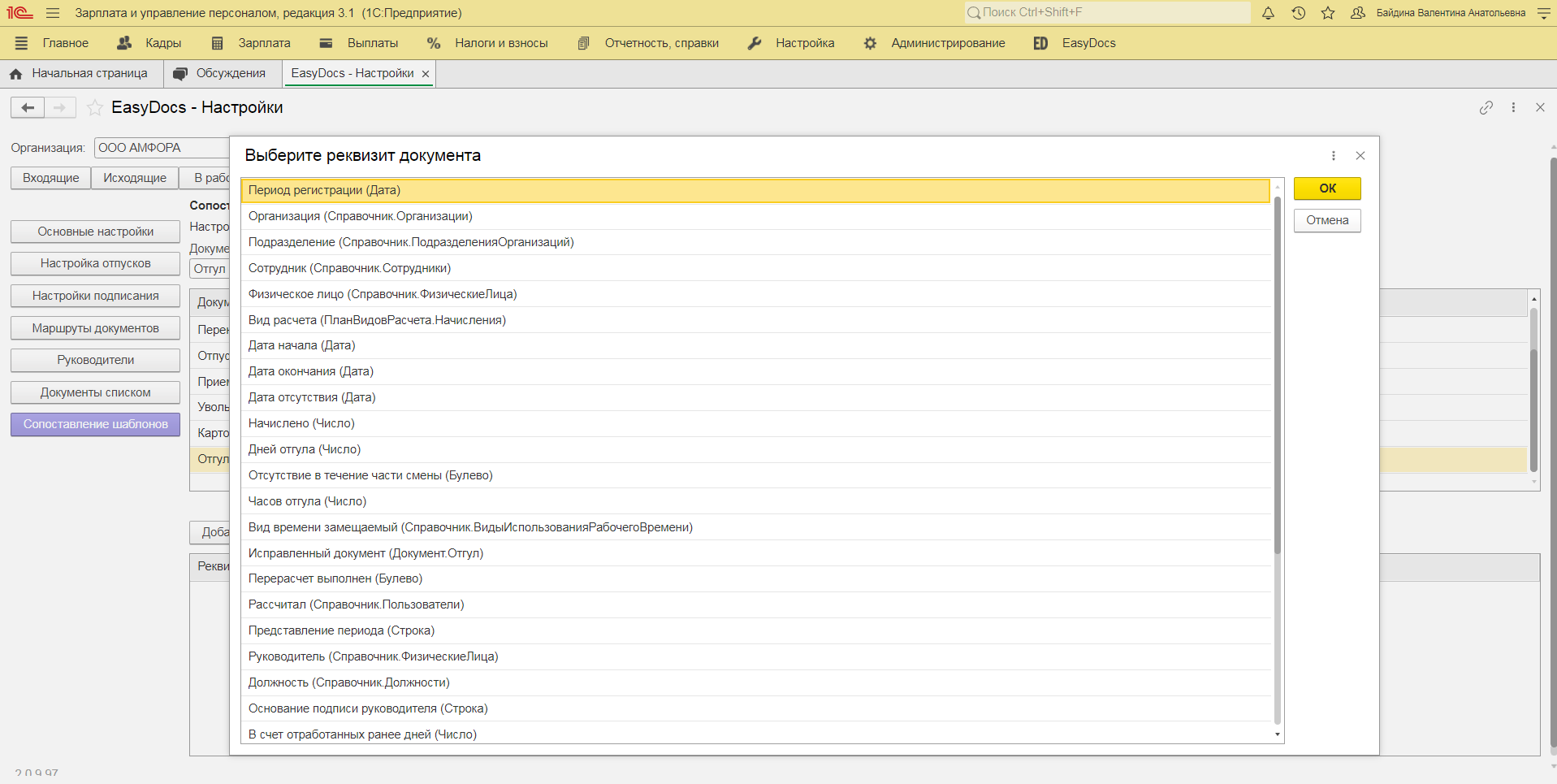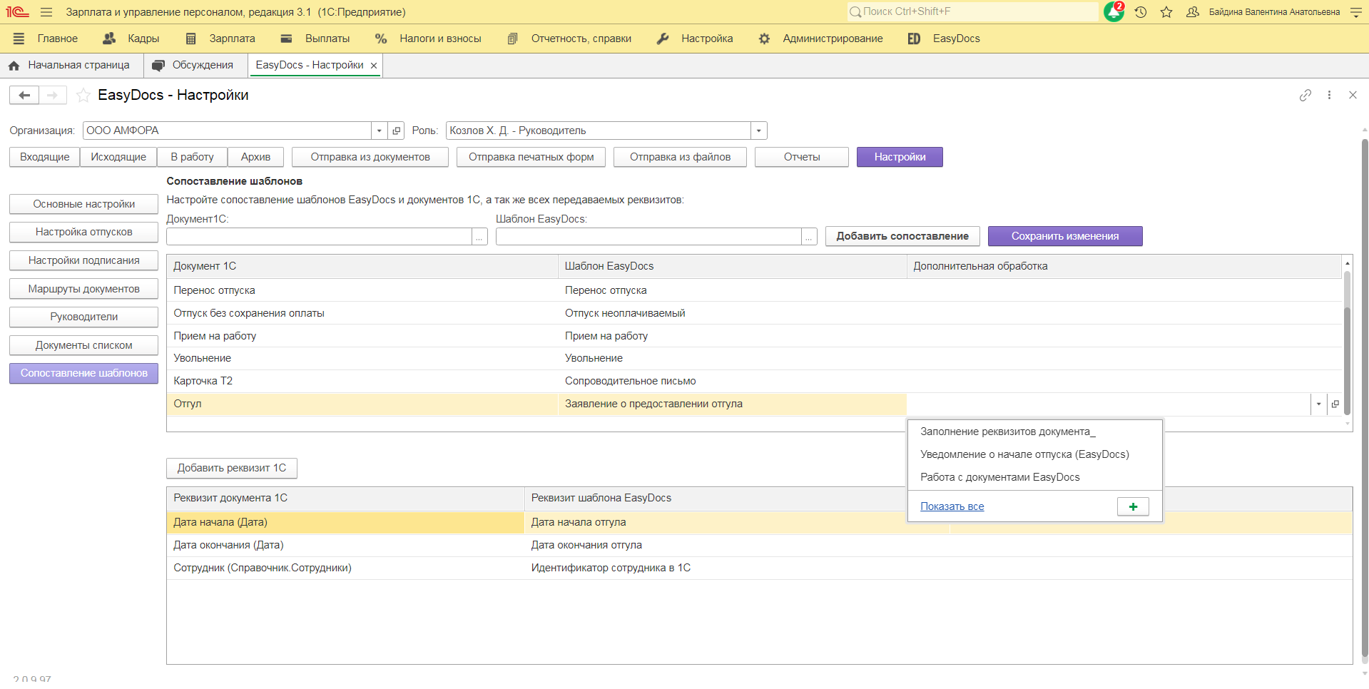 Также на этой форме есть два вида системных шаблонов EasyDocs, которые используются для автоматической подстановки данных о создателе документа: