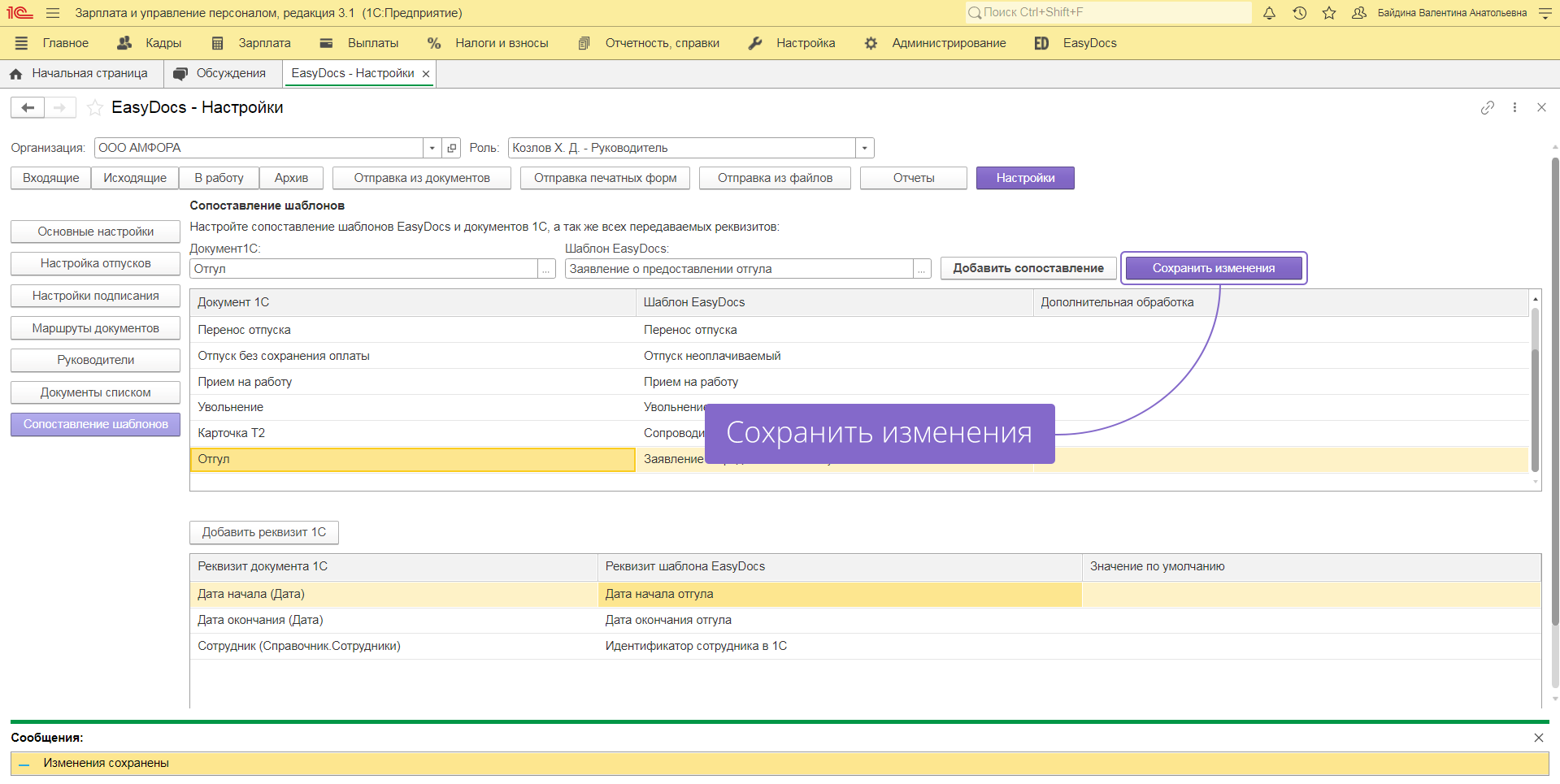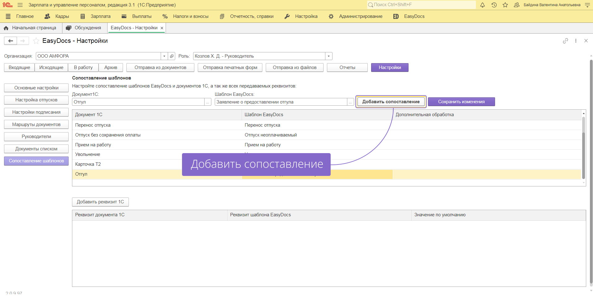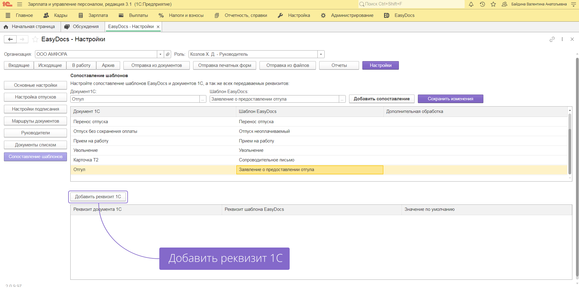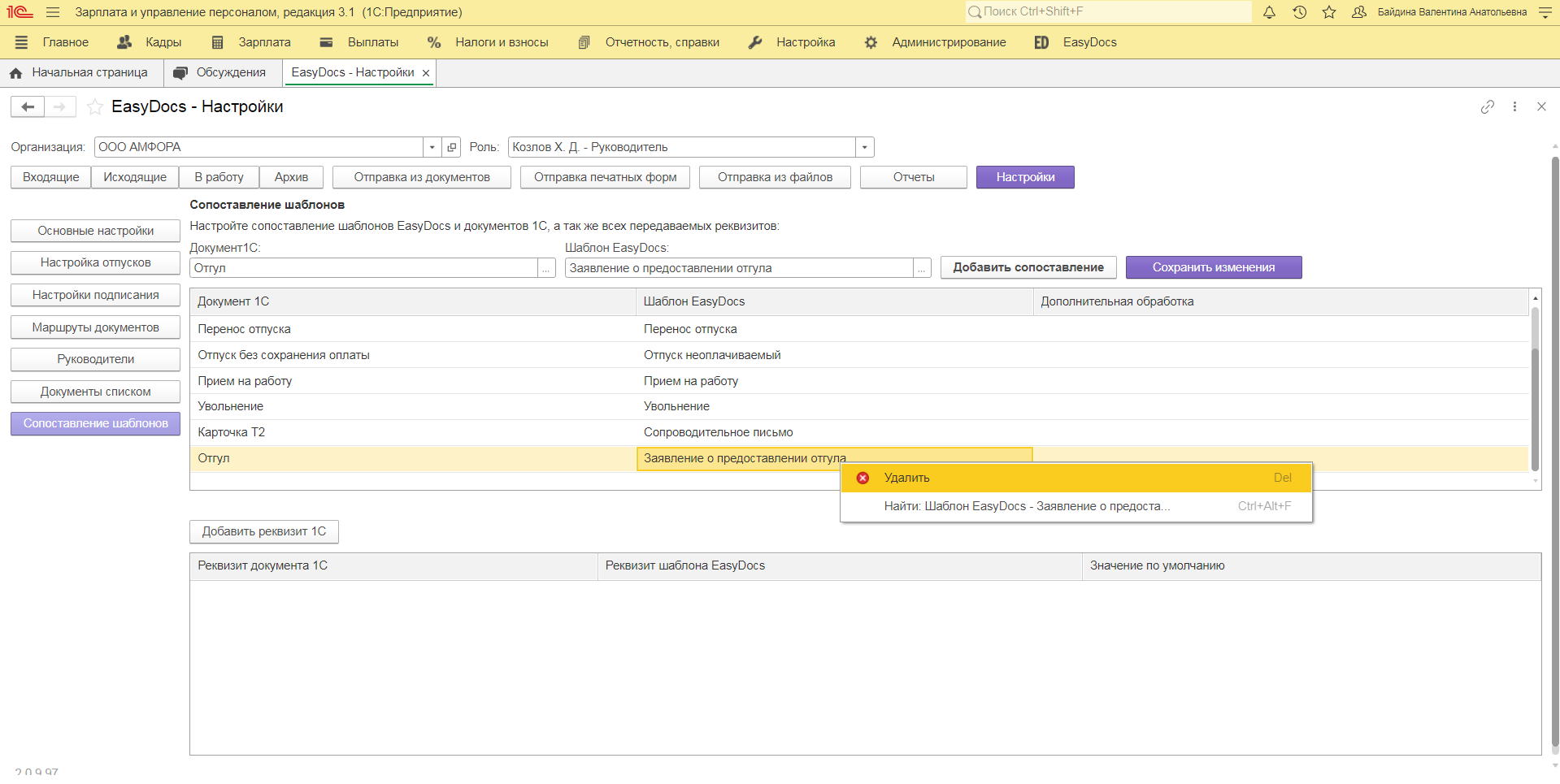 Также на этой форме есть два вида системных шаблонов EasyDocs, которые используются для автоматической подстановки данных о создателе документа:
