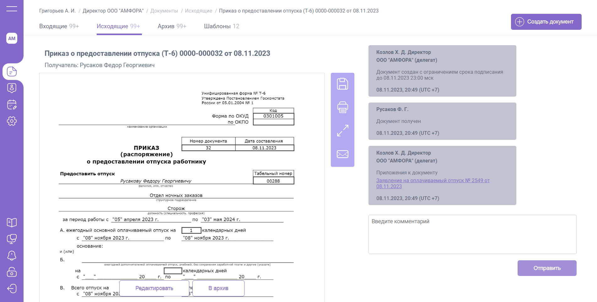 В том случае, если Вы осуществляете отправку печатной формы по документу, который поступил и был проведен на основании шаблона EasyDocs или шаблона Вашей компании с настроенным сопоставлением – в комментариях будет доступна ссылка для перехода к изначальному документу, созданному со стороны сотрудника.