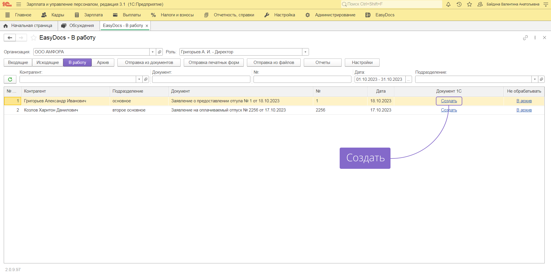 Документ EasyDocs, а также его вложения будут прикреплены «Под скрепку» создаваемого документа 1С.