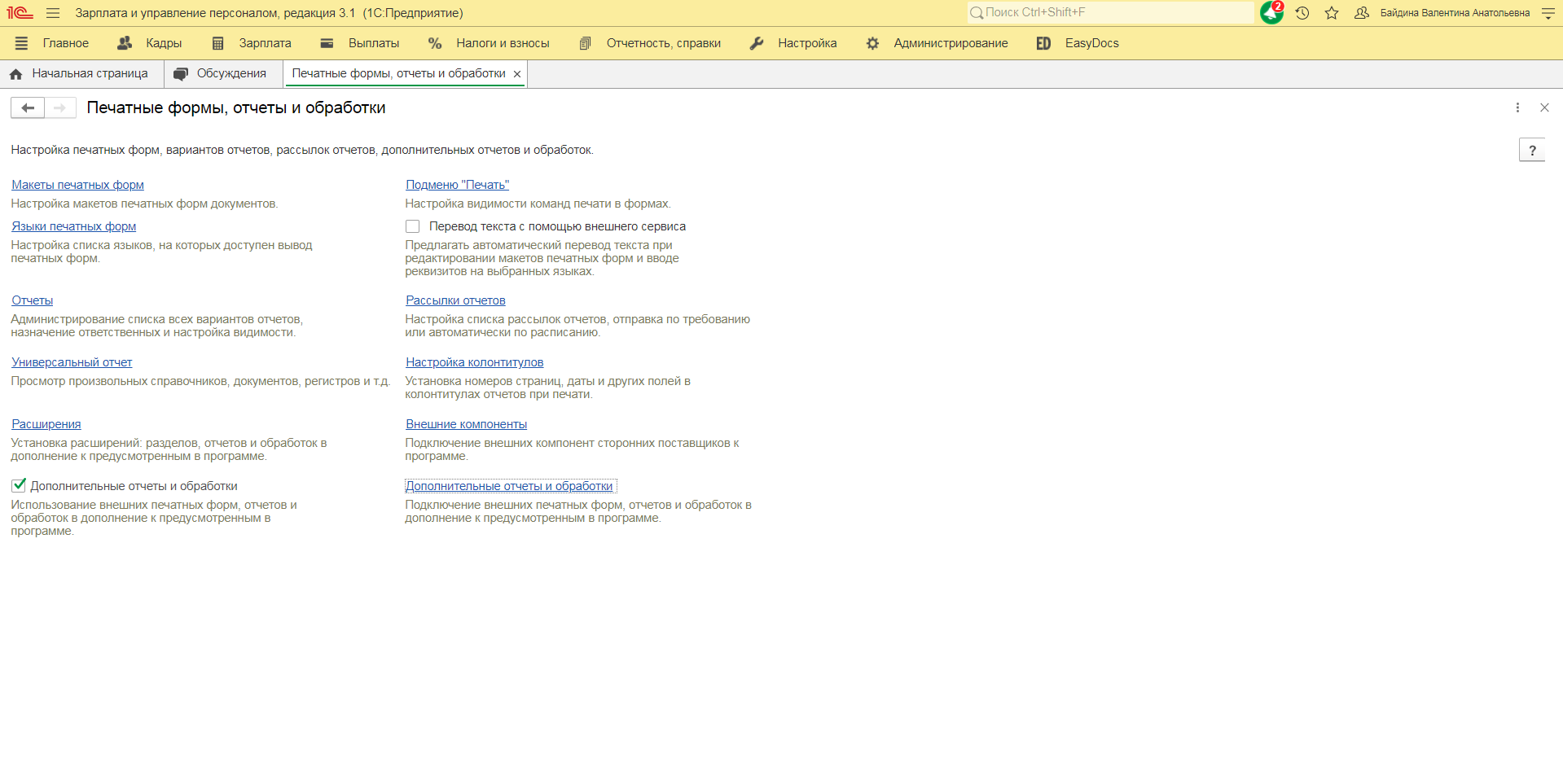 - Перейдите в раздел «Администрирование» / «Печатные формы, отчеты и обработки» / «Дополнительные отчеты и обработки»