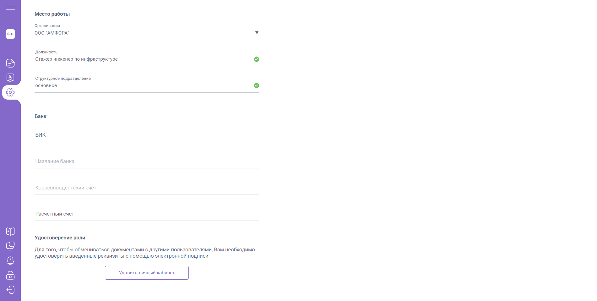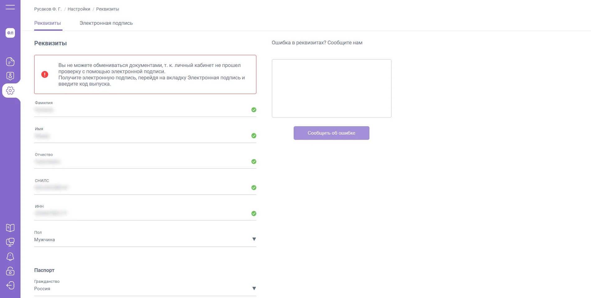 После подтверждения личного кабинета данные, введенные в полях ФИО, СНИЛС, ИНН, пол, становятся недоступным для редактирования.