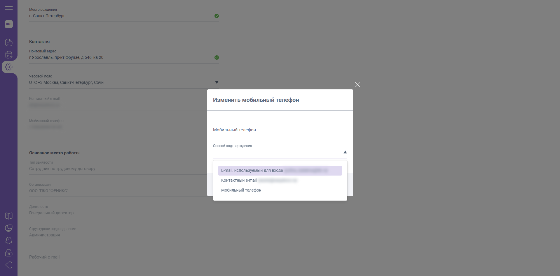 3. Выберите способ подтверждения вносимых изменений (email, используемый для входа, текущий контактный email, текущий мобильный телефон)
