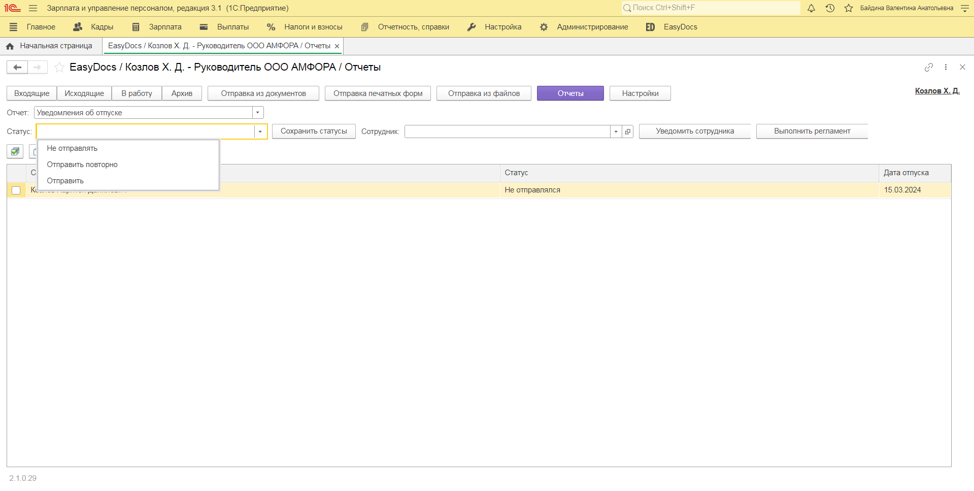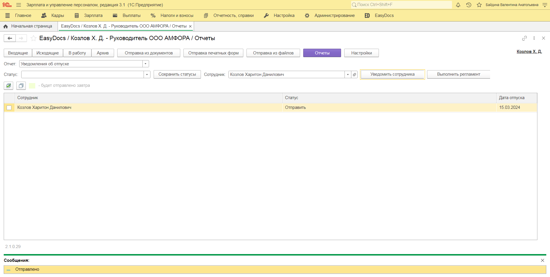 Расширение EasyDocs для получения информации об отпусках сотрудников проверяет наличие документа 1С «График отпусков». При корректном выполнении предыдущих шагов на форме «Отчет: Уведомления» отобразится следующее: