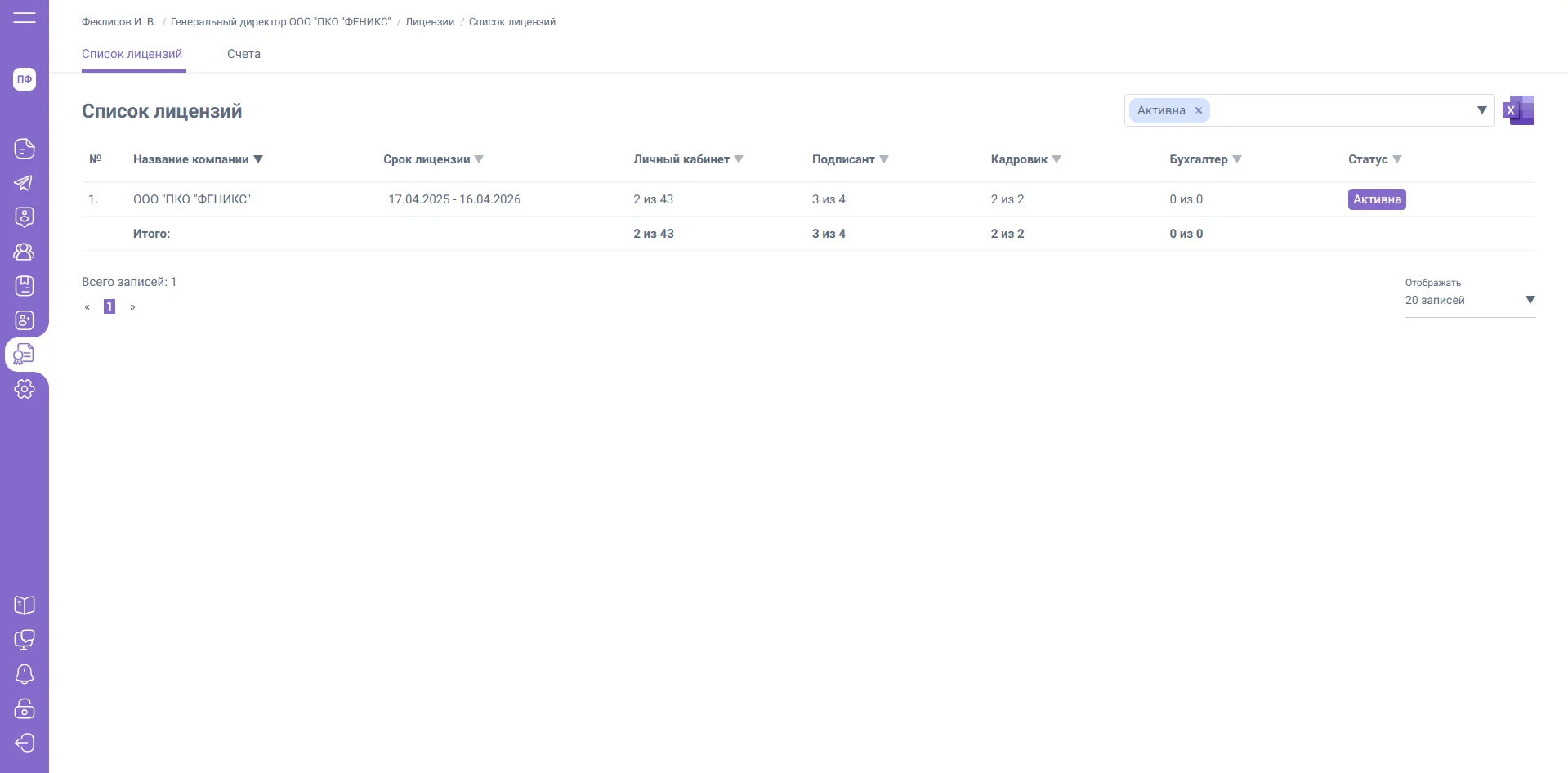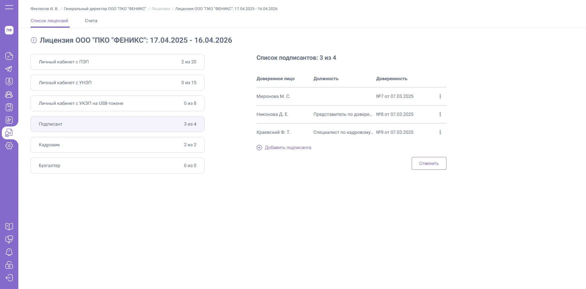 Для добавления подписанта перейдите в раздел «Лицензии» и нажмите на активную лицензию необходимого ЮЛ / ИП.