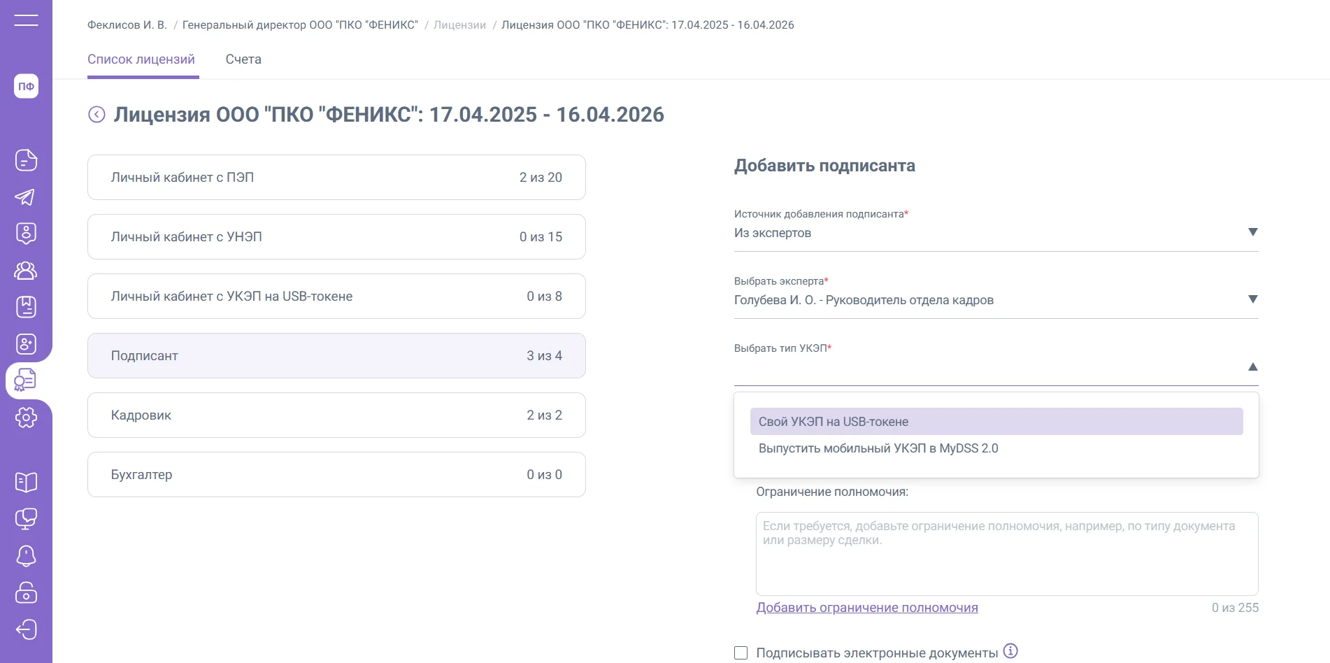 1. Свой УКЭП на USB-токене – лицензия будет установлена автоматически, и подписант сможет приступить к подписанию документов сразу после подписания МЧД ГД / ИП