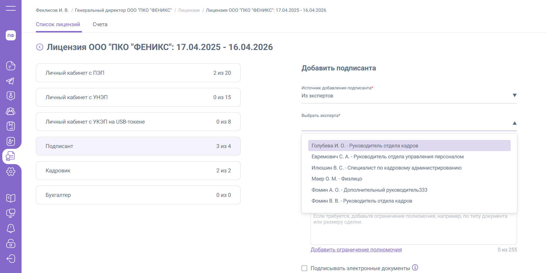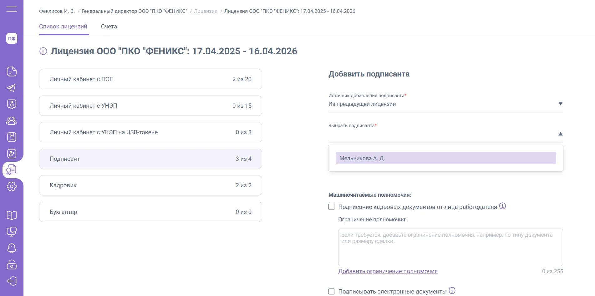 3. «Из предыдущей лицензии» – доступно дополнительное поле «Выбрать подписанта», в котором отображены все подписанты из предыдущей лицензии. Выбранному подписанту будут автоматически заполнены полномочия, установленные в прошлой лицензии.