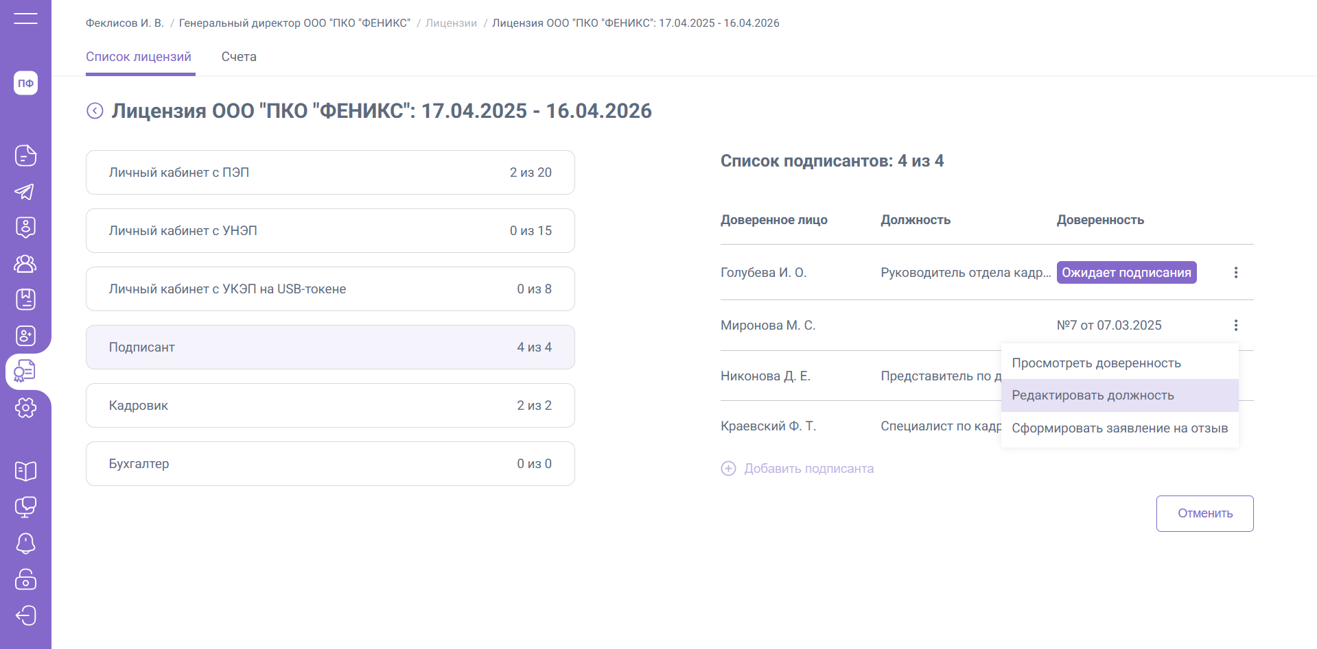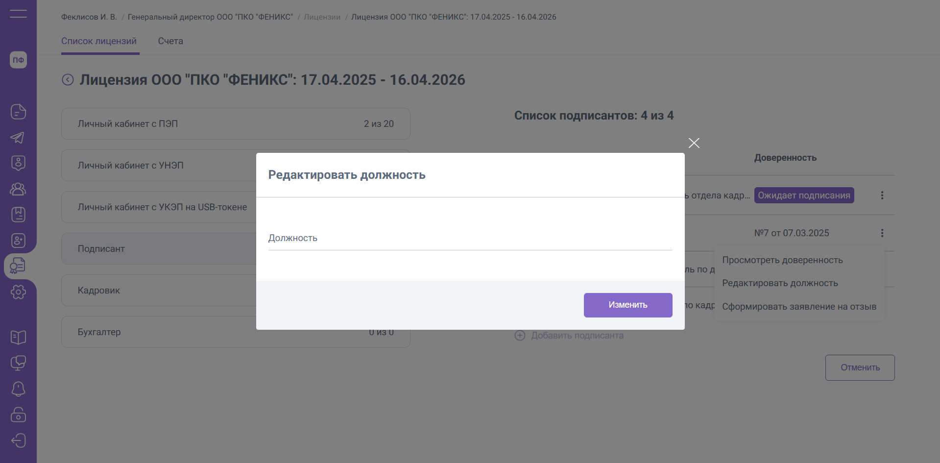 Для того чтобы внести изменения в наименование должности у действующего подписанта Вам необходимо: