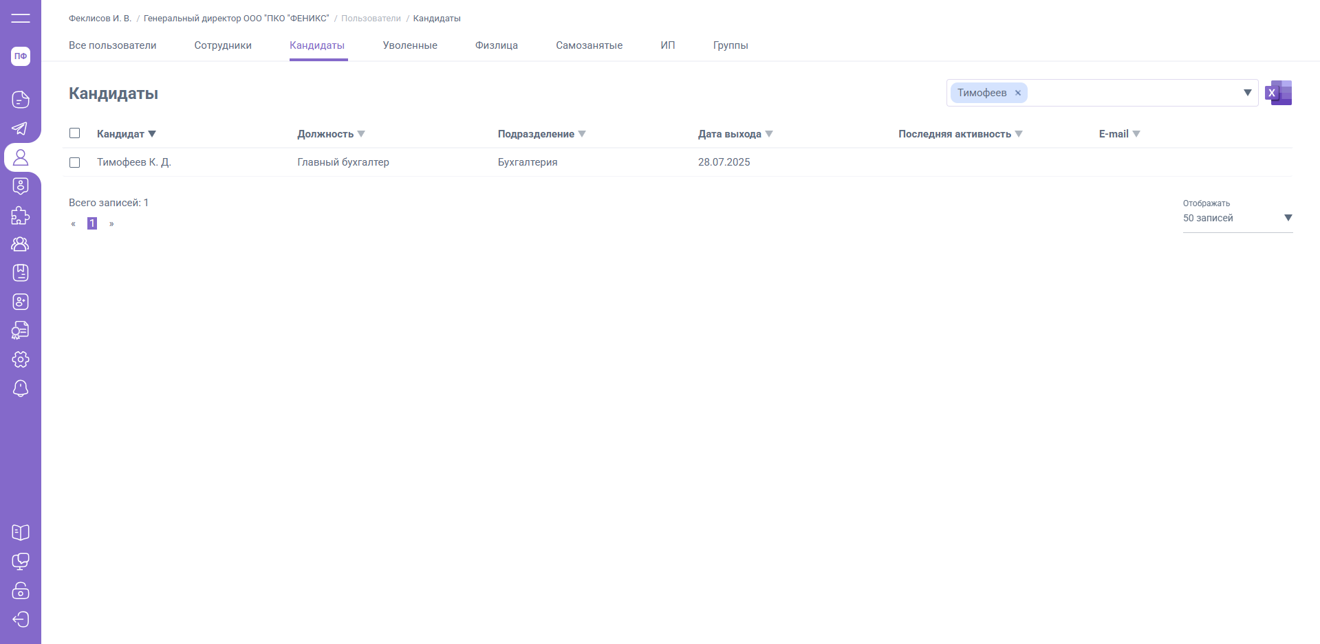 При проведении приема в 1С – кандидат будет перемещен на вкладку «Сотрудники» (кандидат переместится только в том случае, если на стороне ЮЛ / ИП выгружается орг. структура).