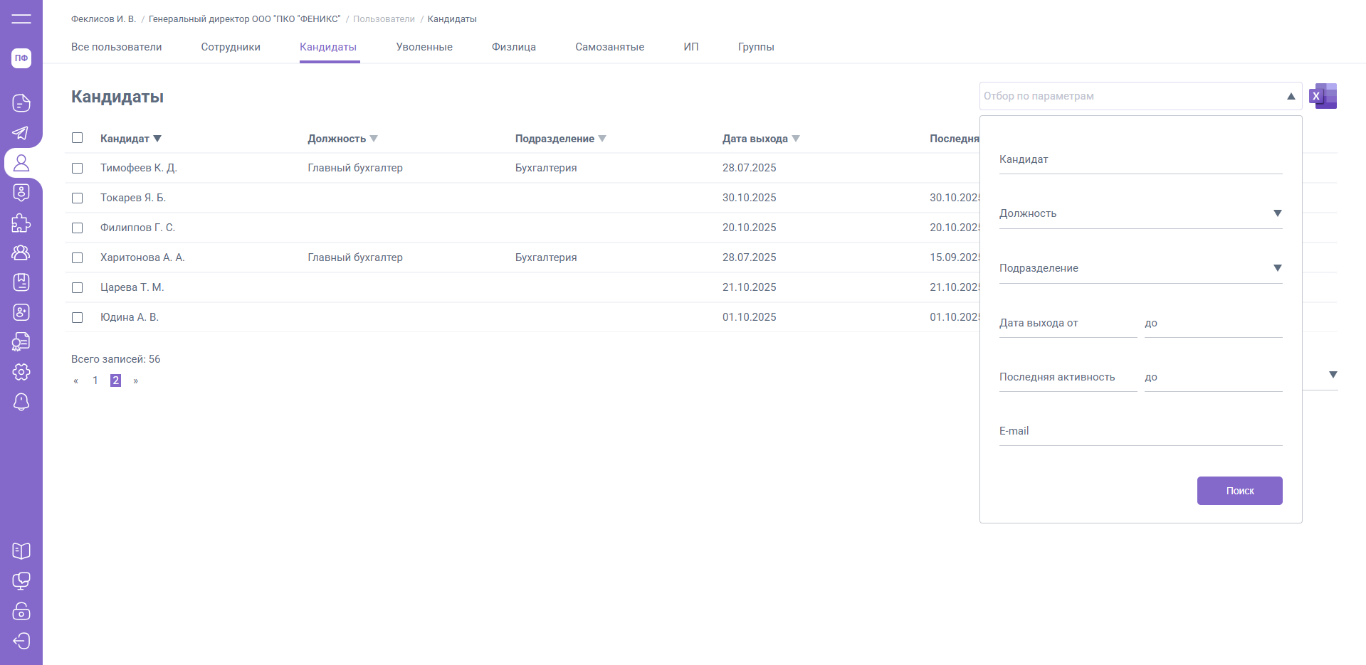 В правом верхнем углу Вы можете выполнить отбор записей вкладки «Кандидаты» по параметрам: