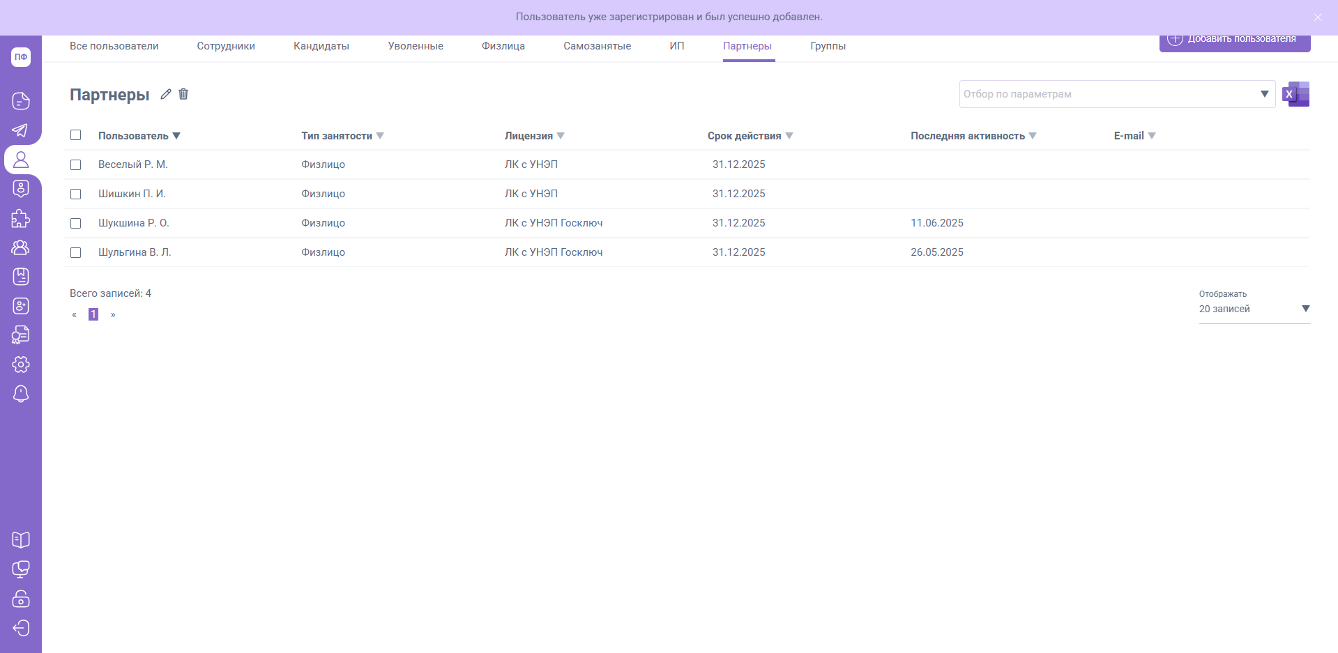 Зарегистрированному пользователю не поступит письмо – приглашение, он будет автоматически добавлен в список пользователей группы и выбранного типа занятости.