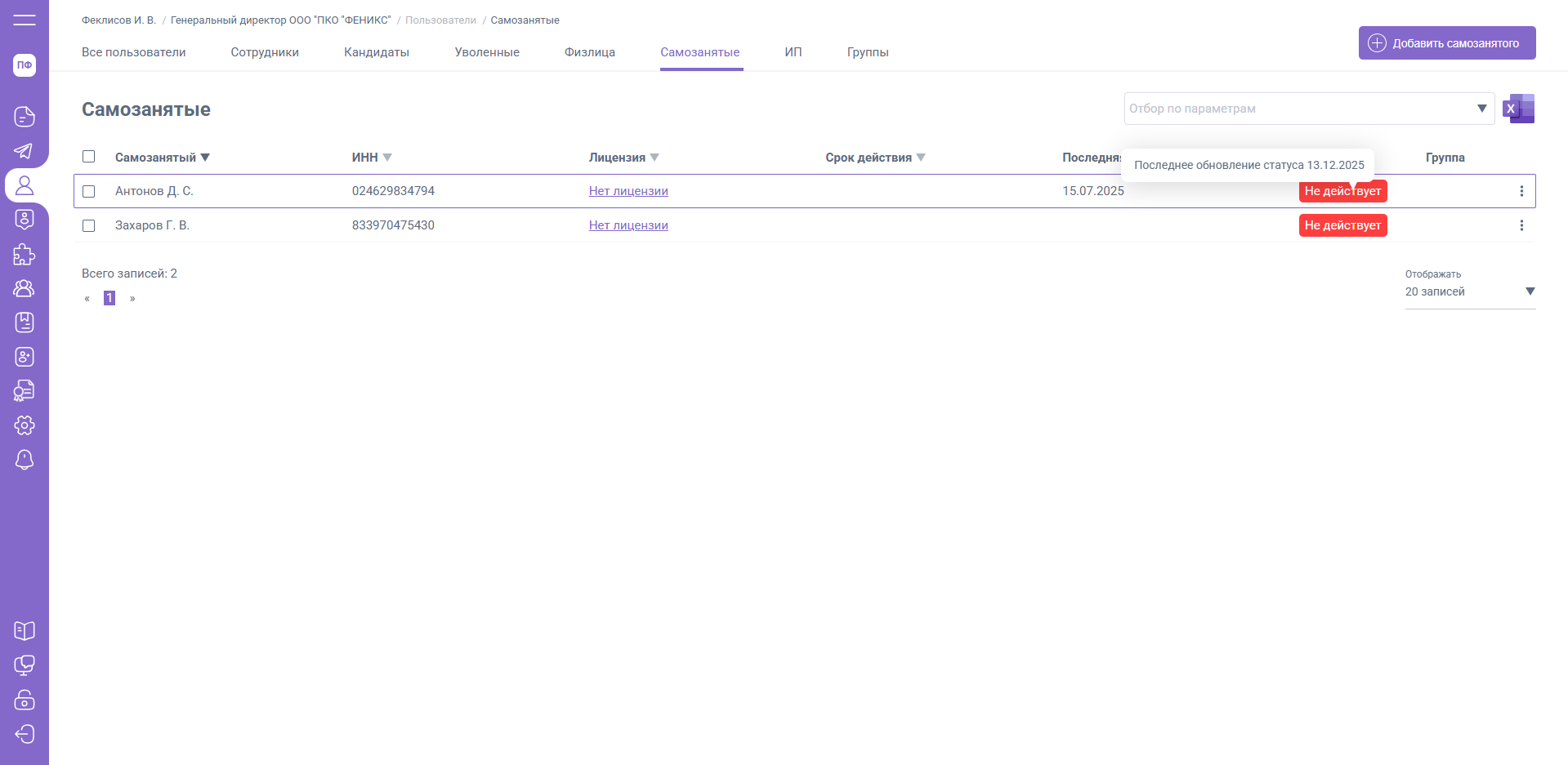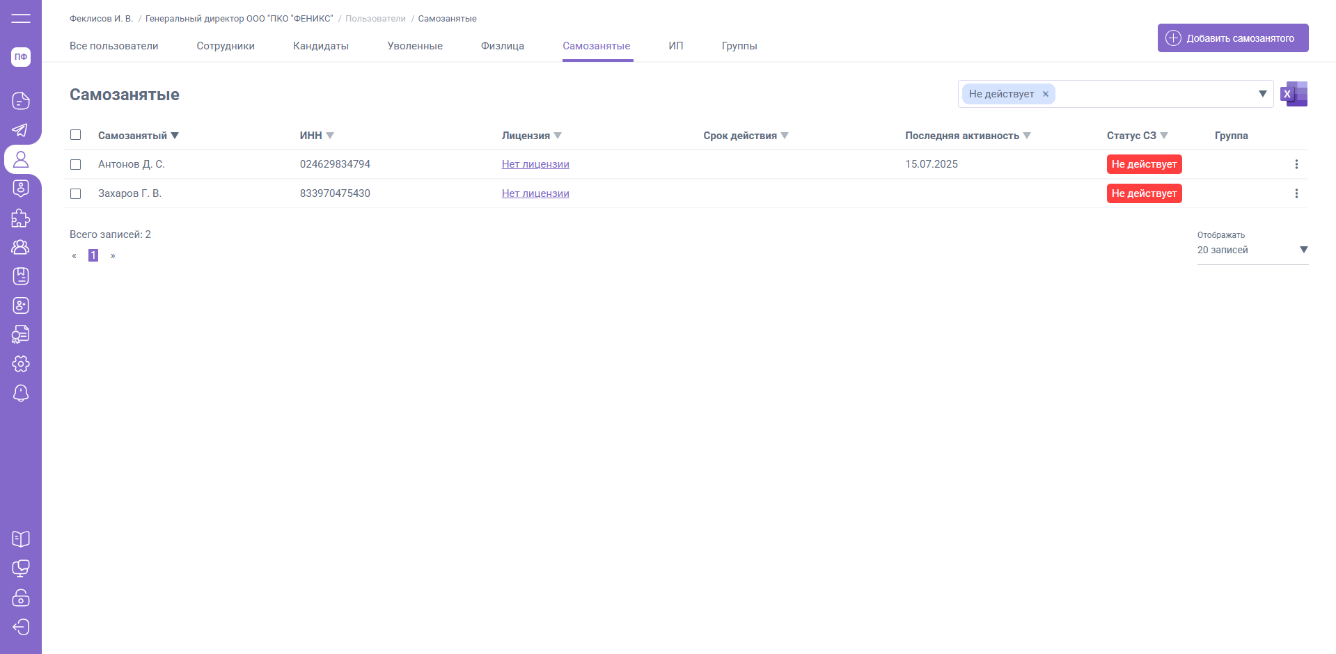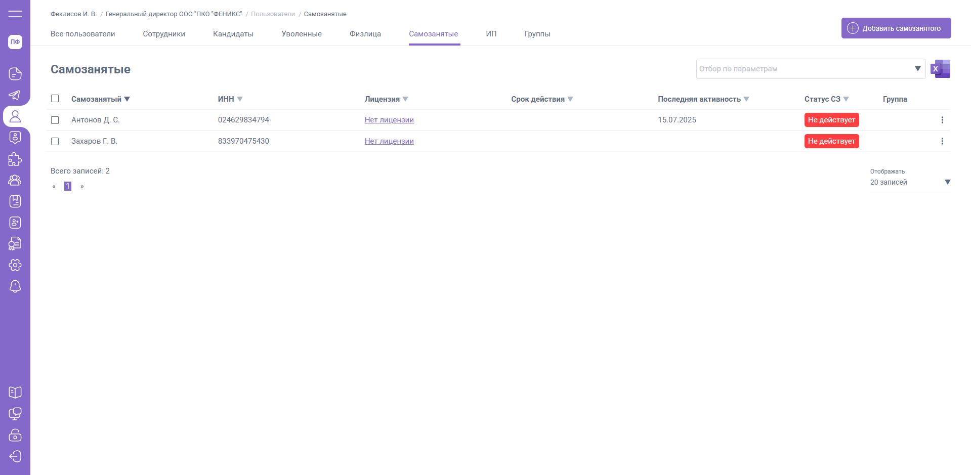 Вкладка «Самозанятые» содержит список пользователей, которые являются внешними исполнителями с официальным налоговым статусом.