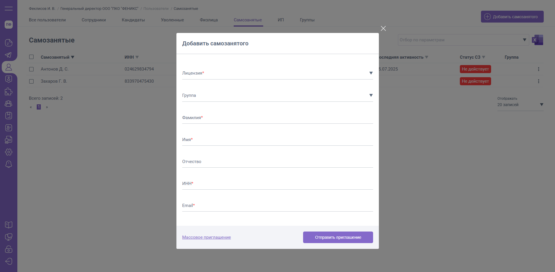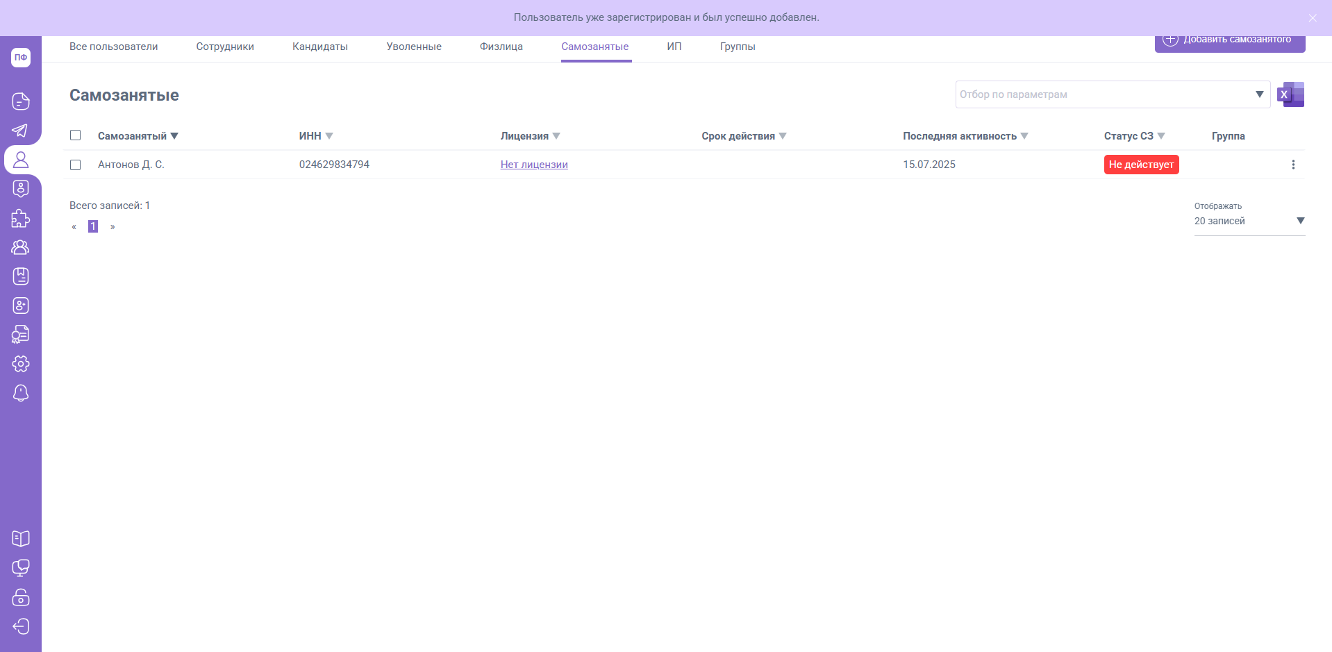 Зарегистрированному пользователю не поступит письмо – приглашение, он будет автоматически добавлен в список вкладки «Самозанятые».