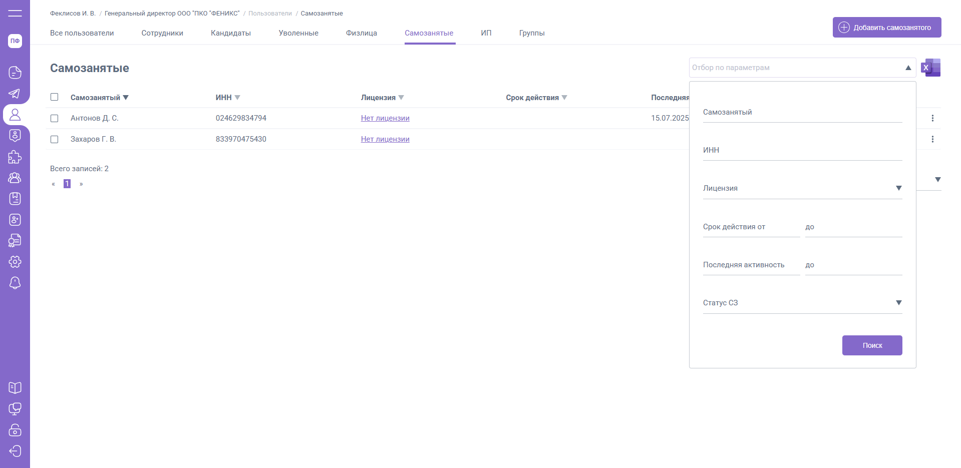 В правом верхнем углу Вы можете выполнить отбор записей вкладки «Самозанятые» по параметрам: