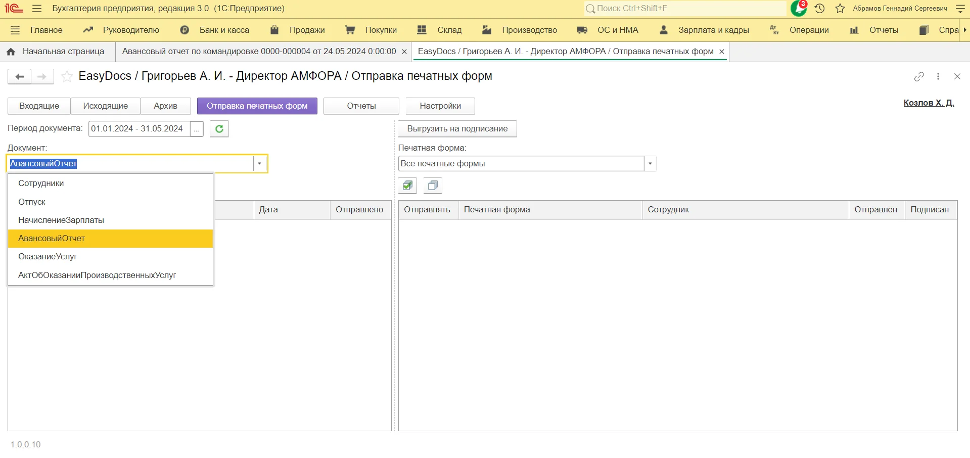 Отправить авансовый отчет можно из раздела «Отправка печатных форм». Документ уйдет на подпись по тому маршруту, который был указан в настройках.