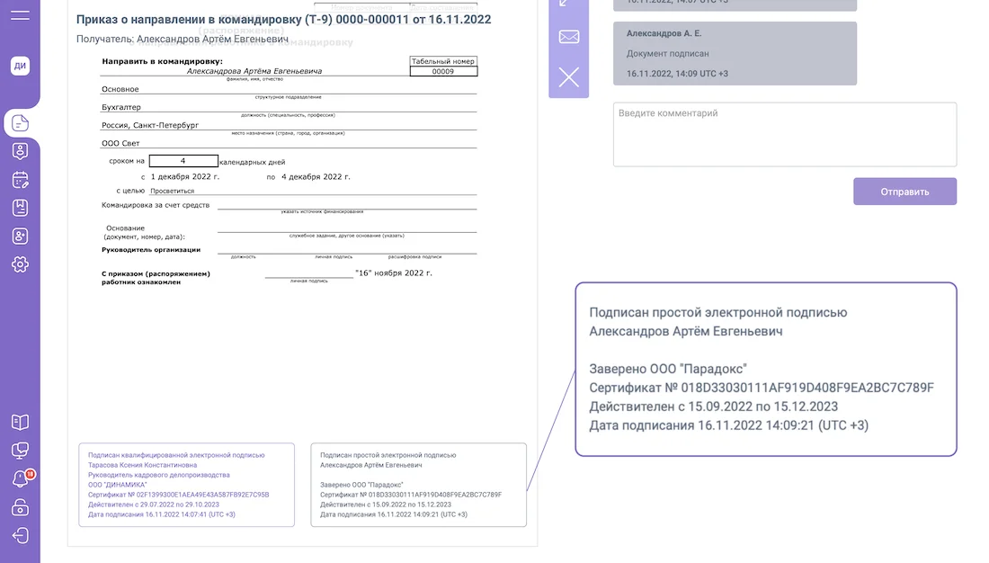 Информация о том, что, что документ заверен квалифицированной электронной подписью ООО "Парадокс", отображается на штампе подписи: