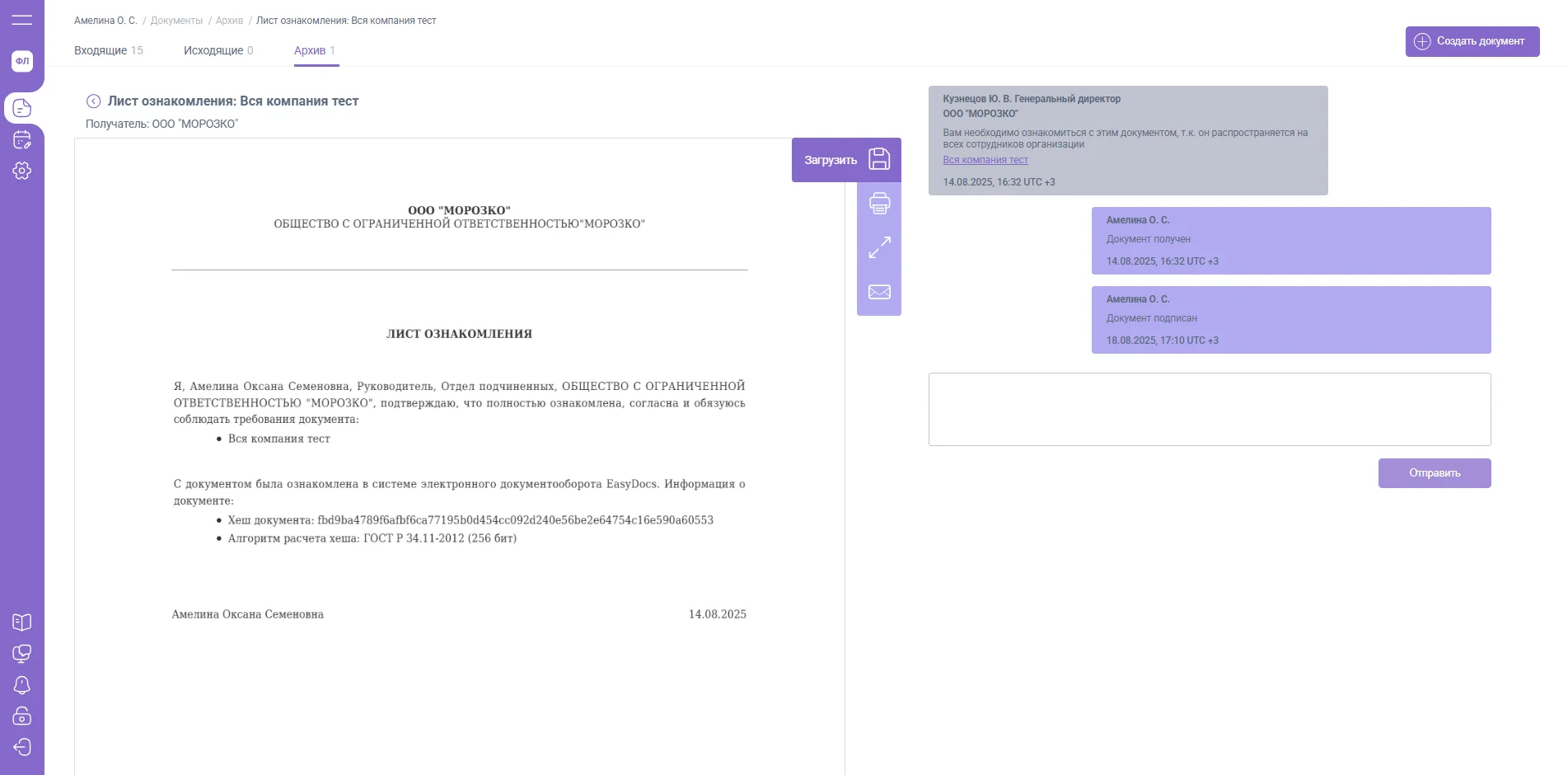 - Лица, подписавшего документ. С помощью открытого ключа электронной подписи устанавливается пользователь EasyDocs и определяются его данные
