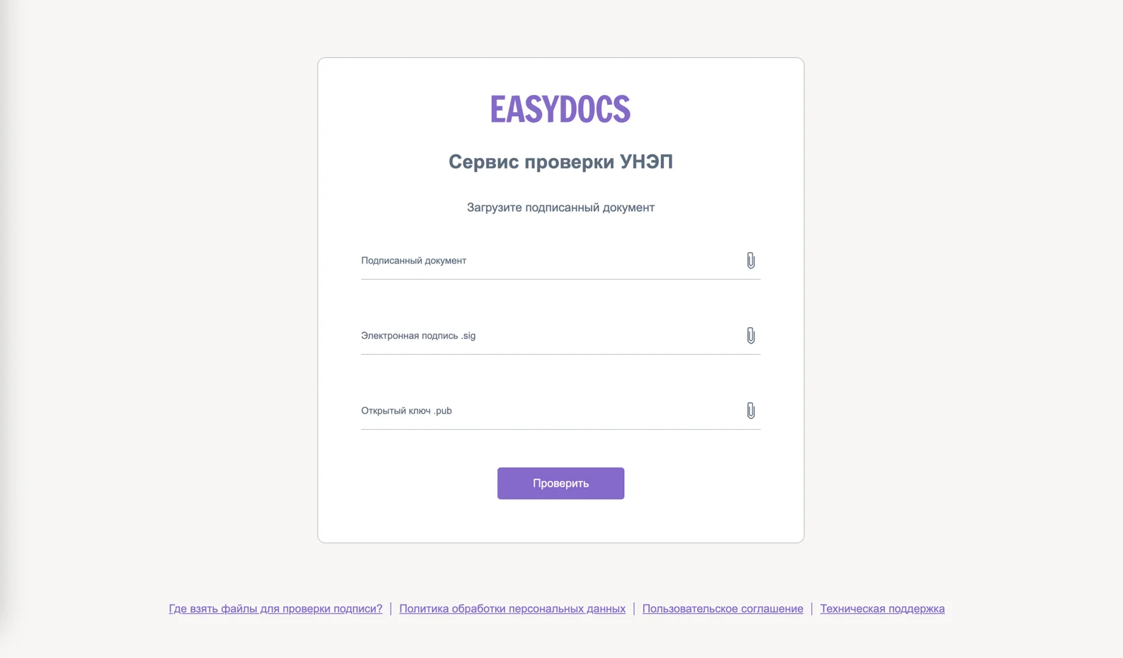 Скачайте все вложения документа и перейдите на страницу проверки УНЭП EasyDocs: https://proverka-unep.easydocs.ru.