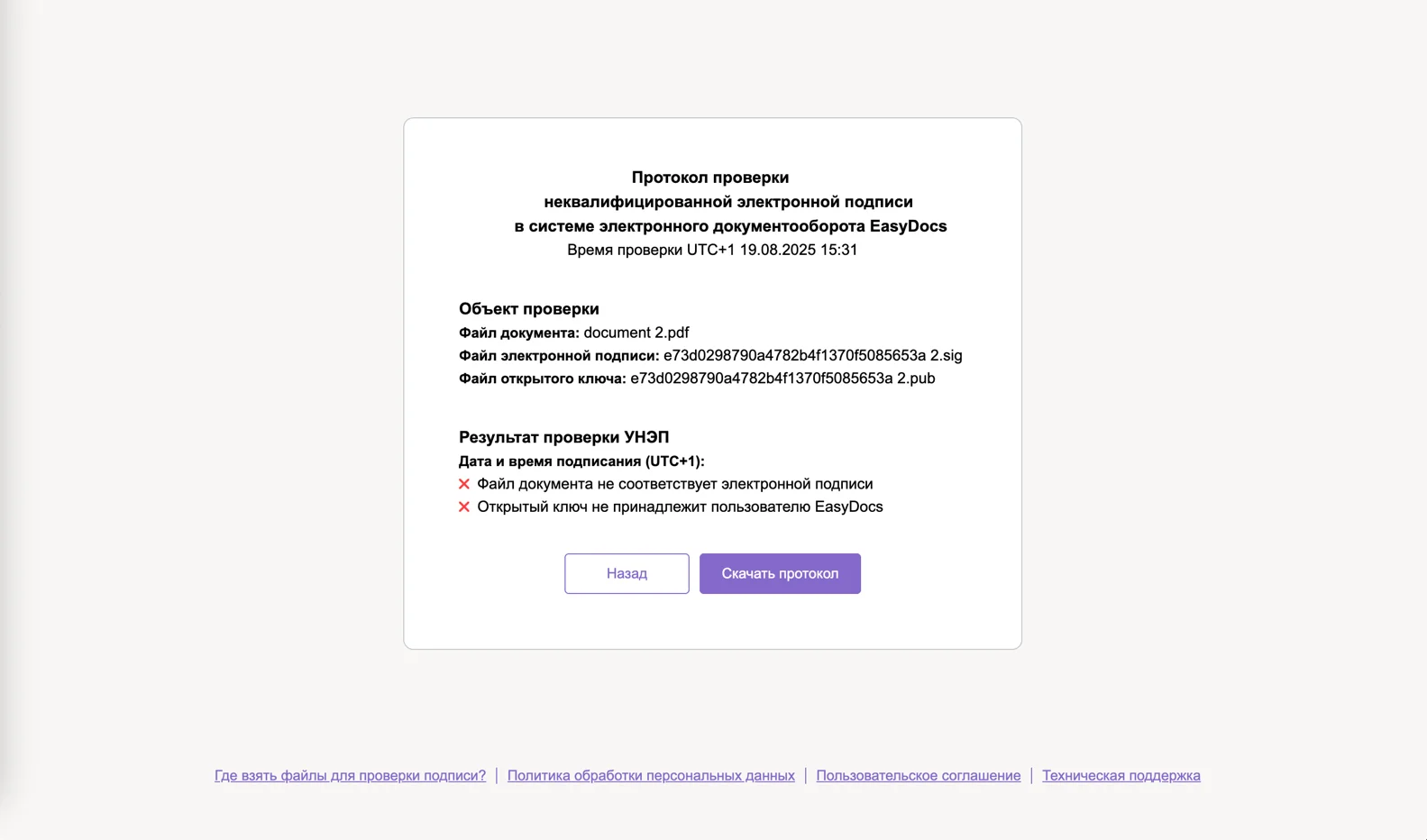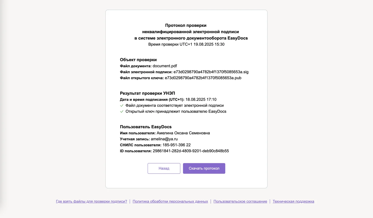 Если нажать на кнопку «Скачать протокол», то результат проверки скачается в виде PDF-файла.