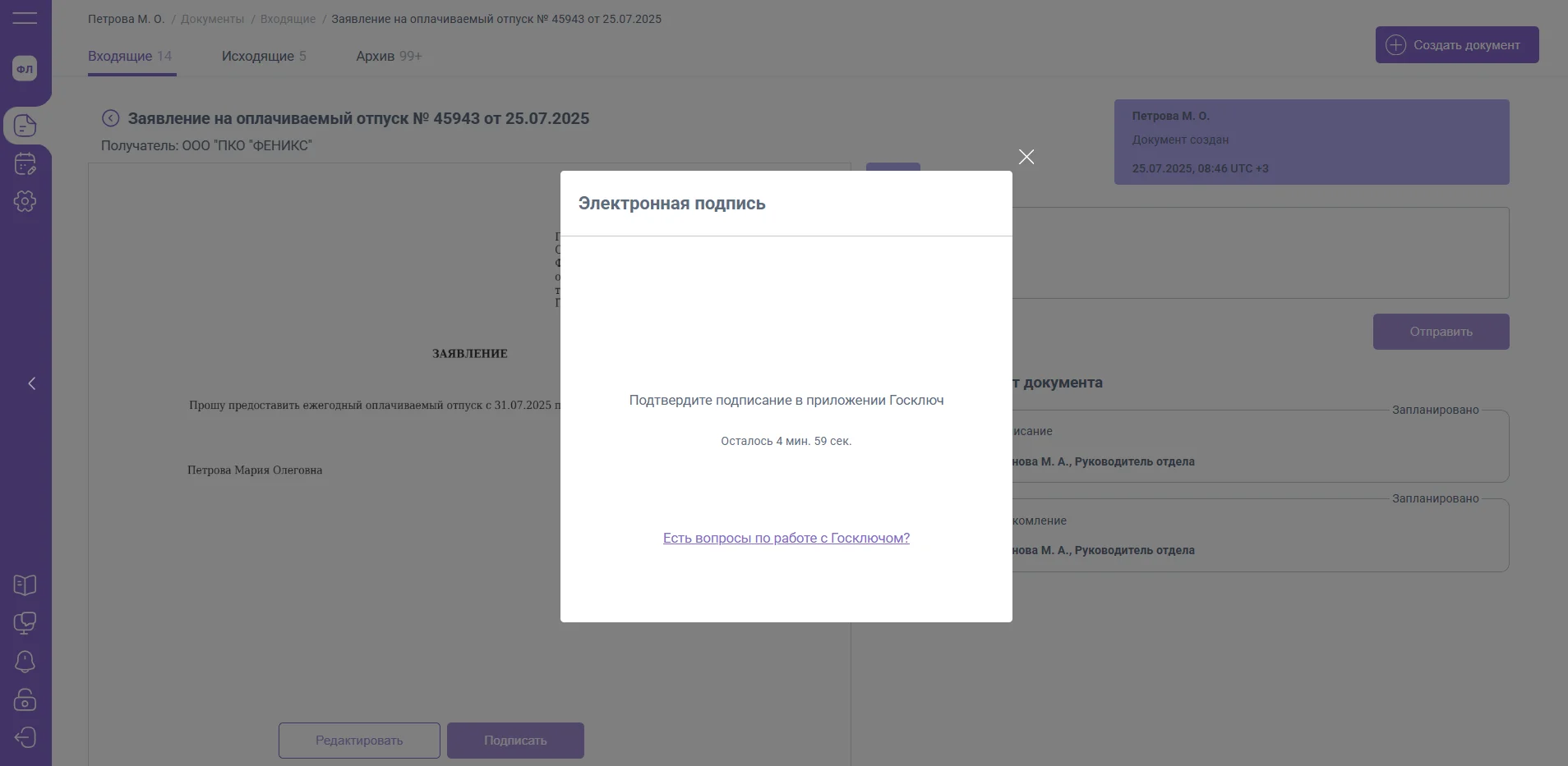 Статус подписания изменится, если в приложении «Госключ» было подтверждено подписание в течение 5 минут.