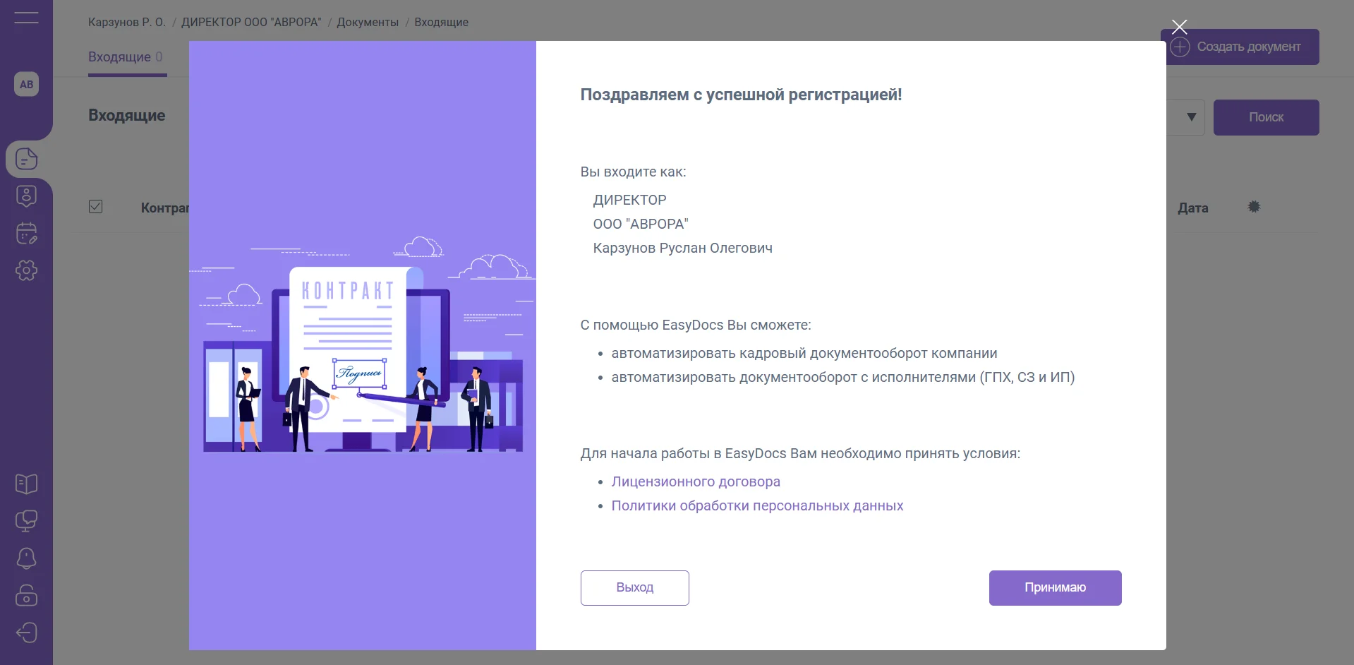 При первом входе необходимо ознакомиться с Лицензионным договором и Политикой обработки персональных данных.